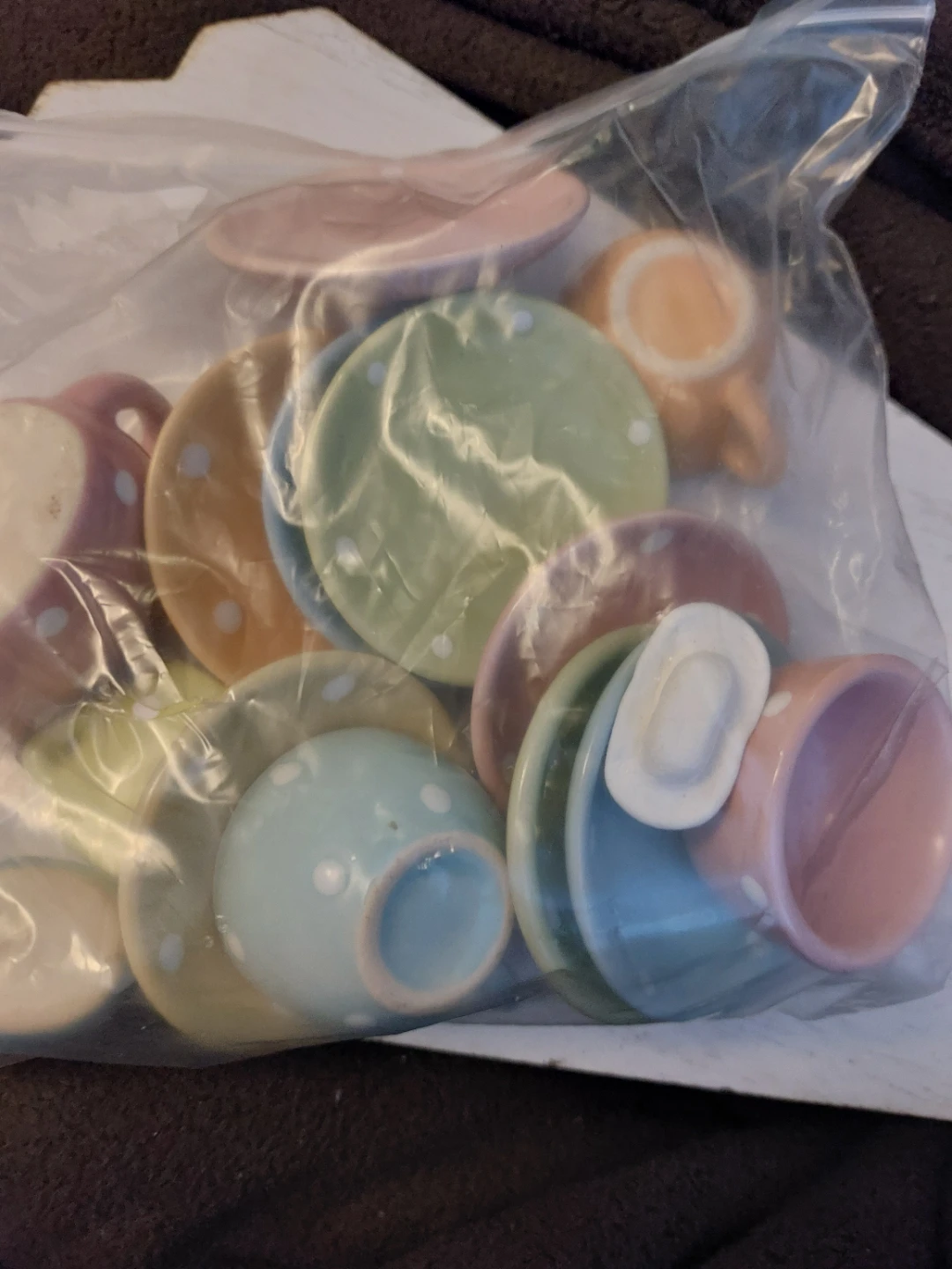 A colourful set of ceramic teacups and saucers, each with a cute polka dot design. It's perfect for pretend play or as a decorative piece. The set appears to be for children's play.