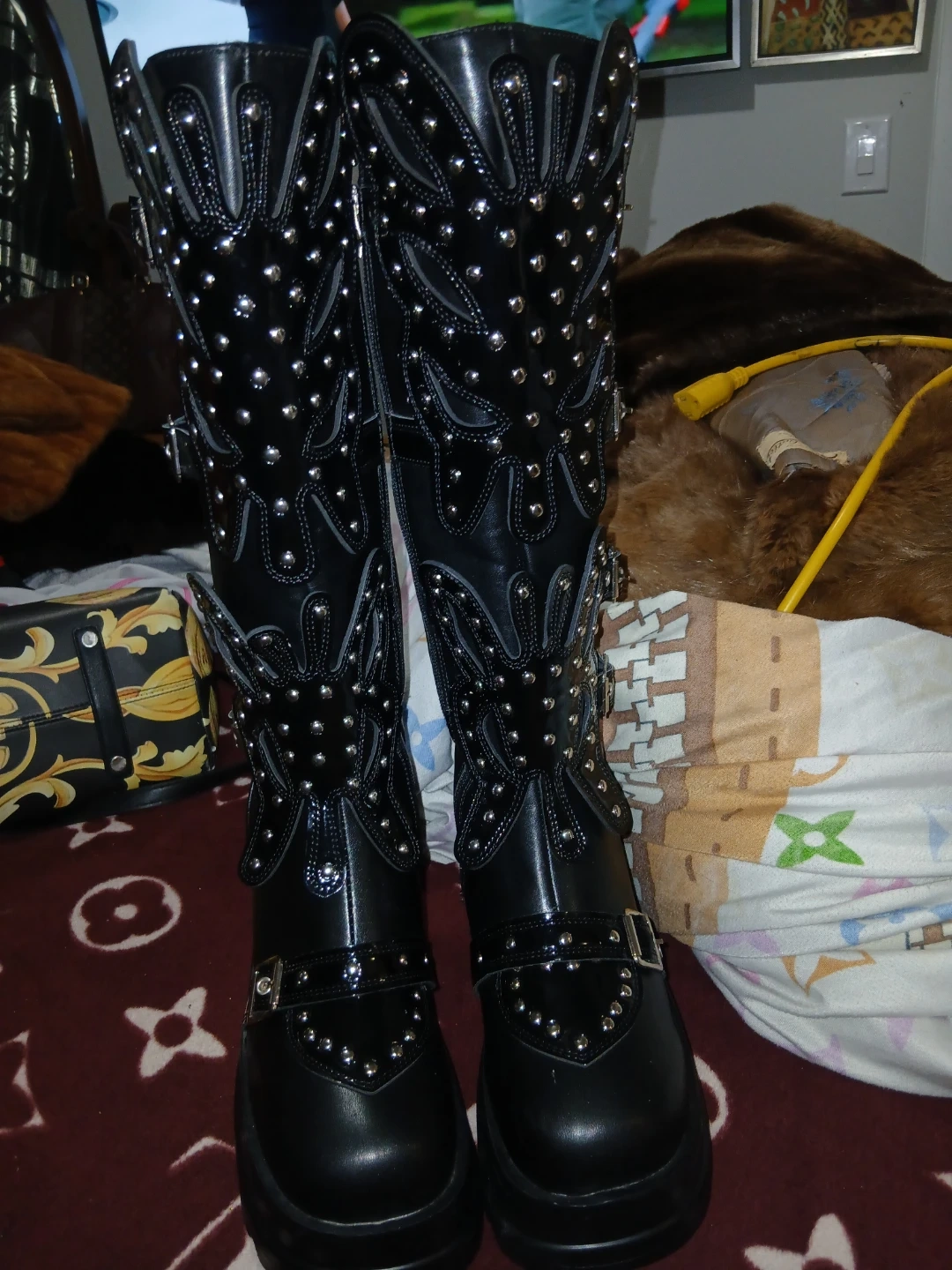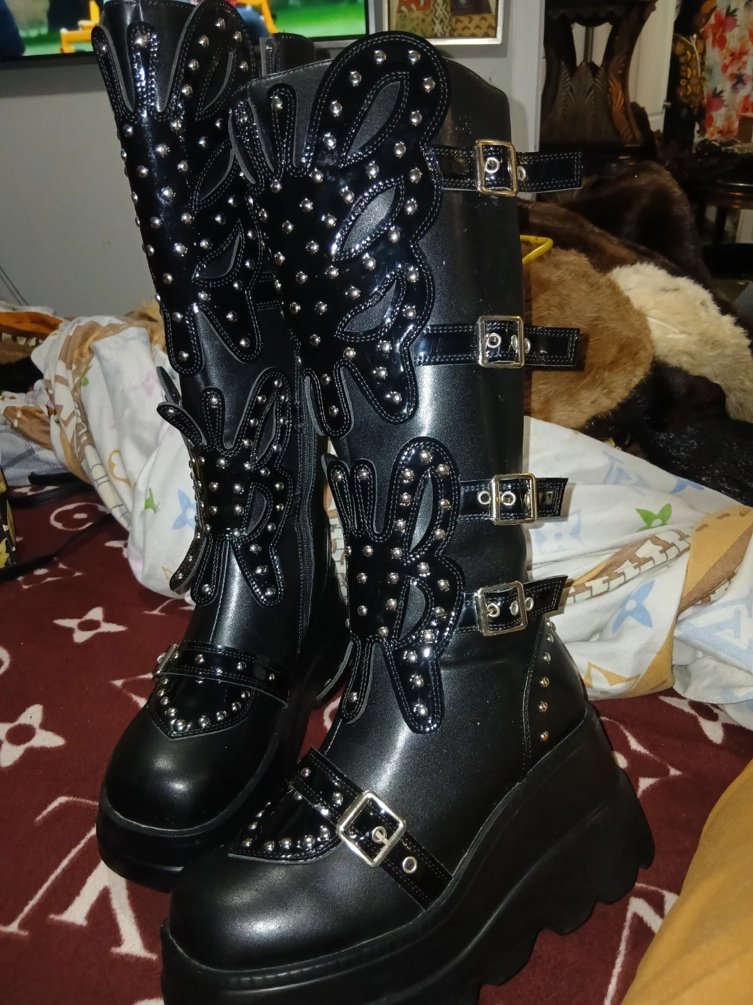 These black platform boots are quite the statement piece! They feature a studded design and multiple buckle straps. They're in good condition and ready for a new home