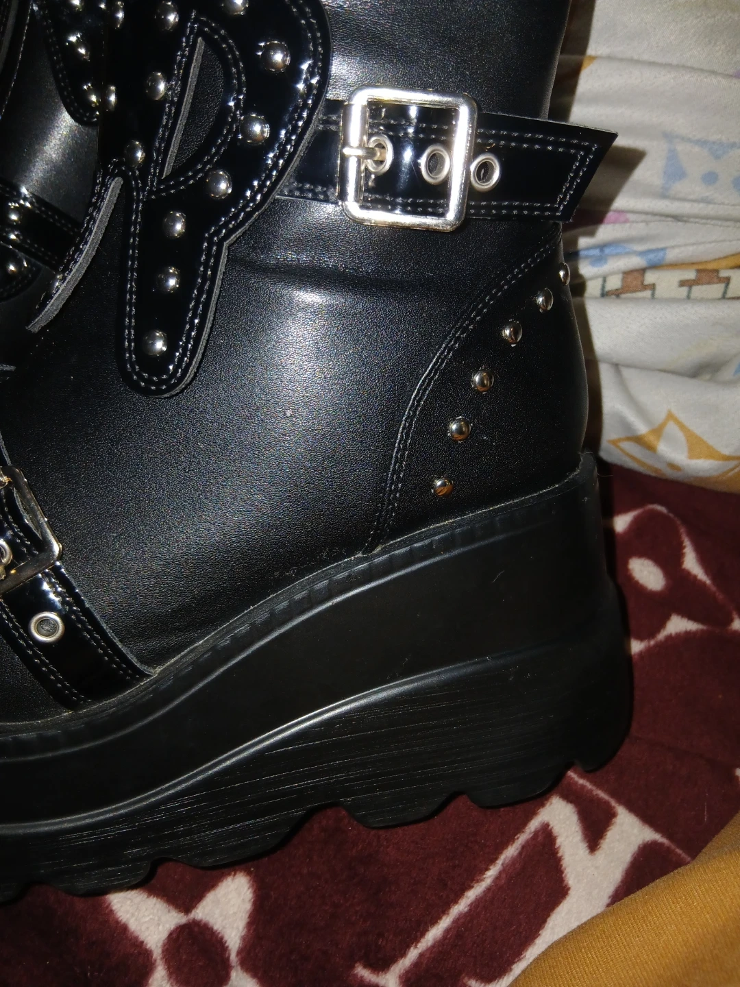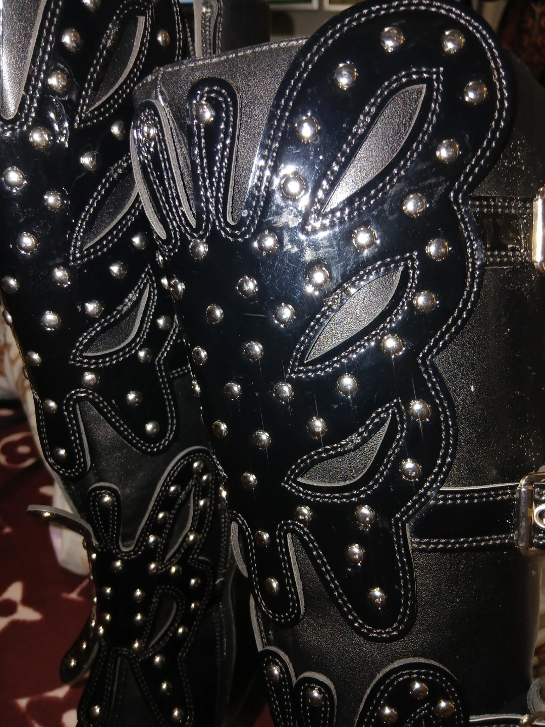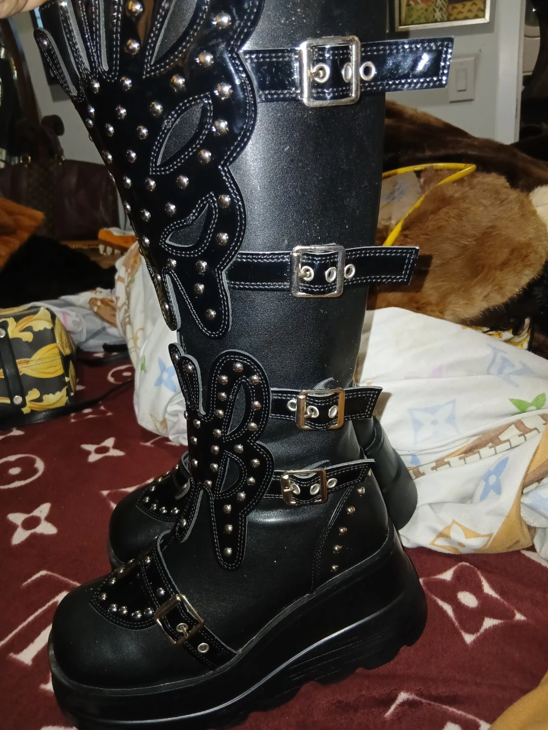 These black platform boots are quite the statement piece! They feature a studded design and multiple buckle straps. They're in good condition and ready for a new home