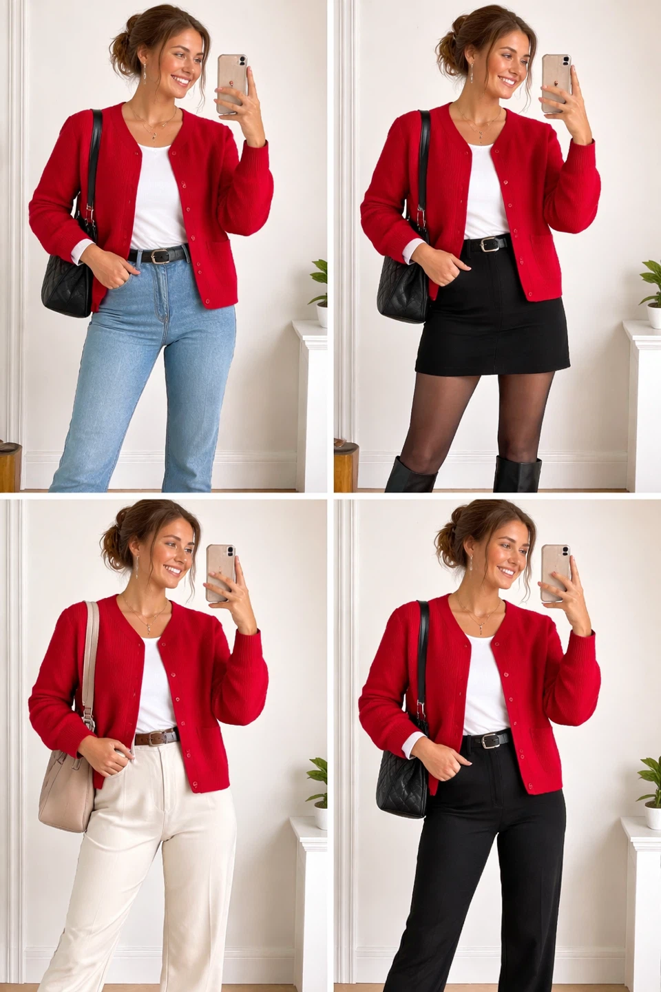 A cozy red cardigan sweater, perfect for layering! It looks great with jeans, skirts, or pants. It's in good condition and ready for a new wardrobe