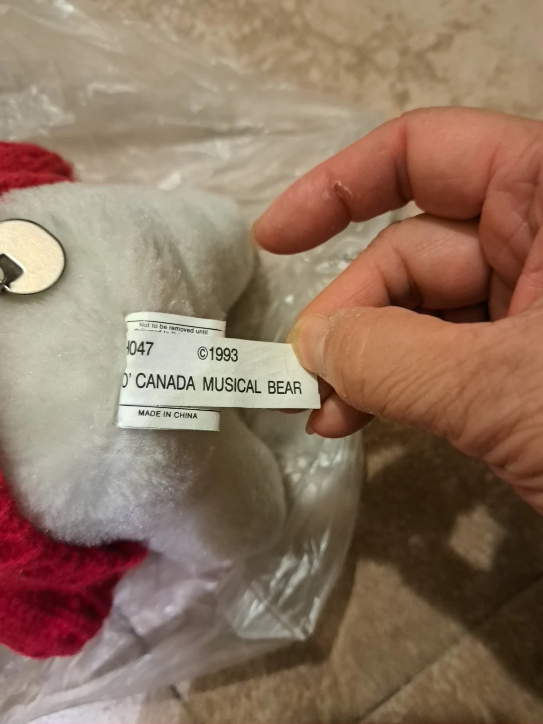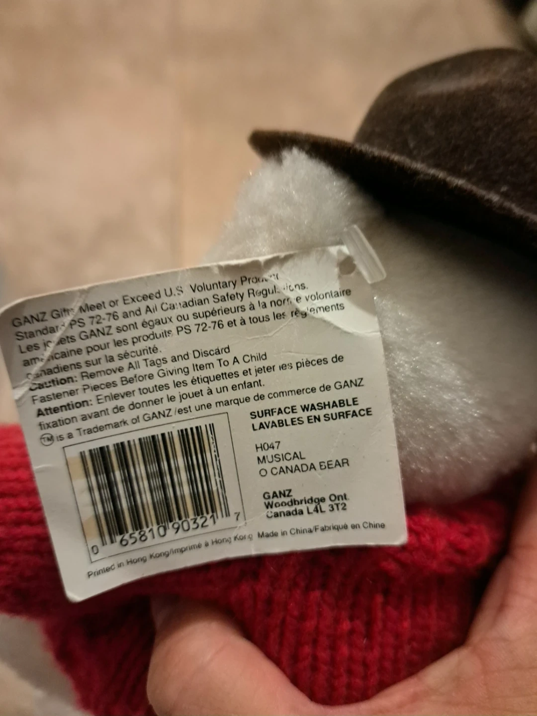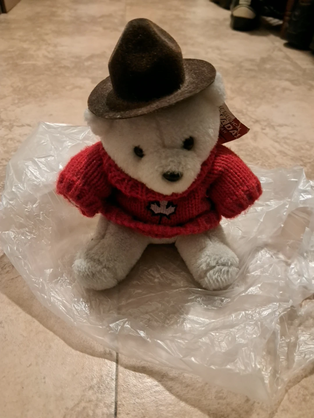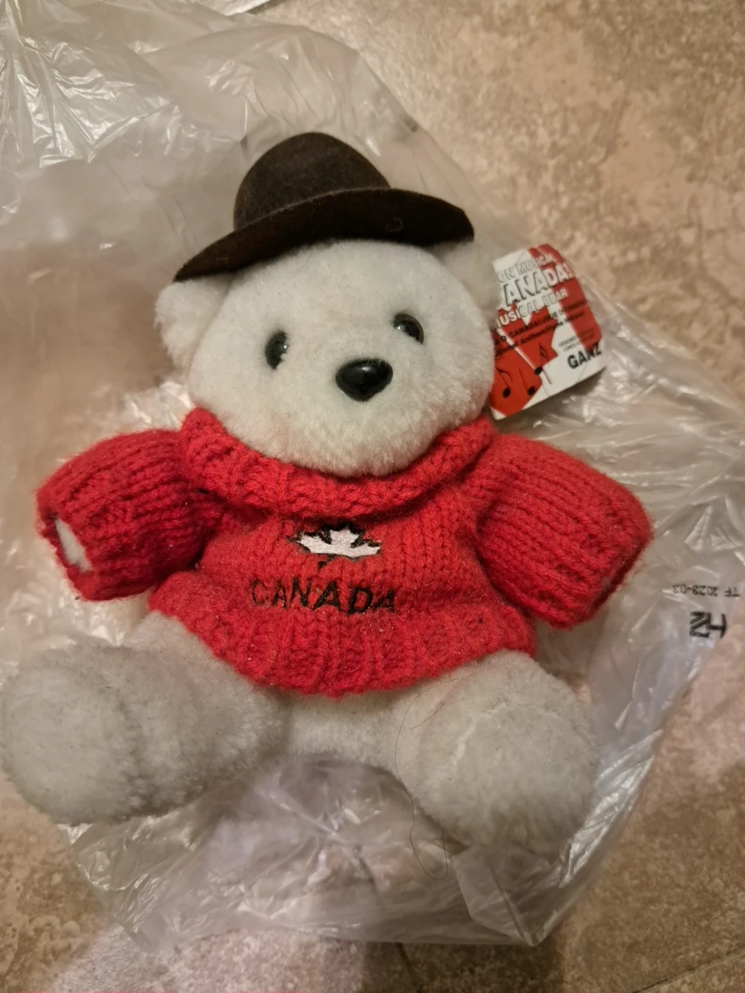 This is a Vintage Ganz O Canada Musical Bear plush 1993. It's wearing a red sweater with 'CANADA' and a maple leaf on it, plus a brown hat. The terry bear plays 'O Canada' music.