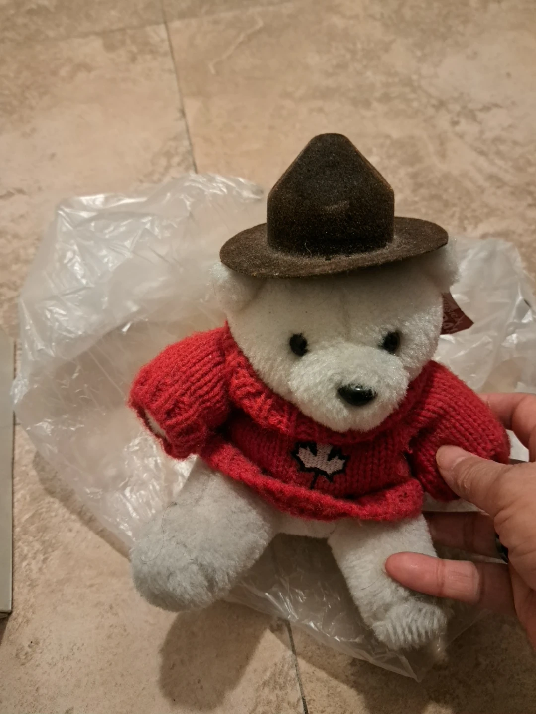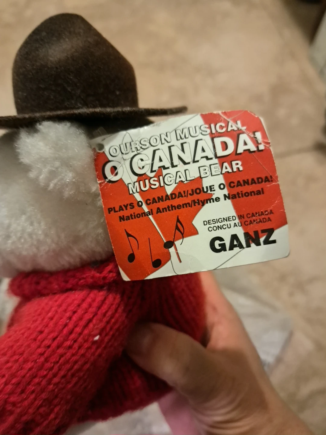 This is a Vintage Ganz O Canada Musical Bear plush 1993. It's wearing a red sweater with 'CANADA' and a maple leaf on it, plus a brown hat. The terry bear plays 'O Canada' music.