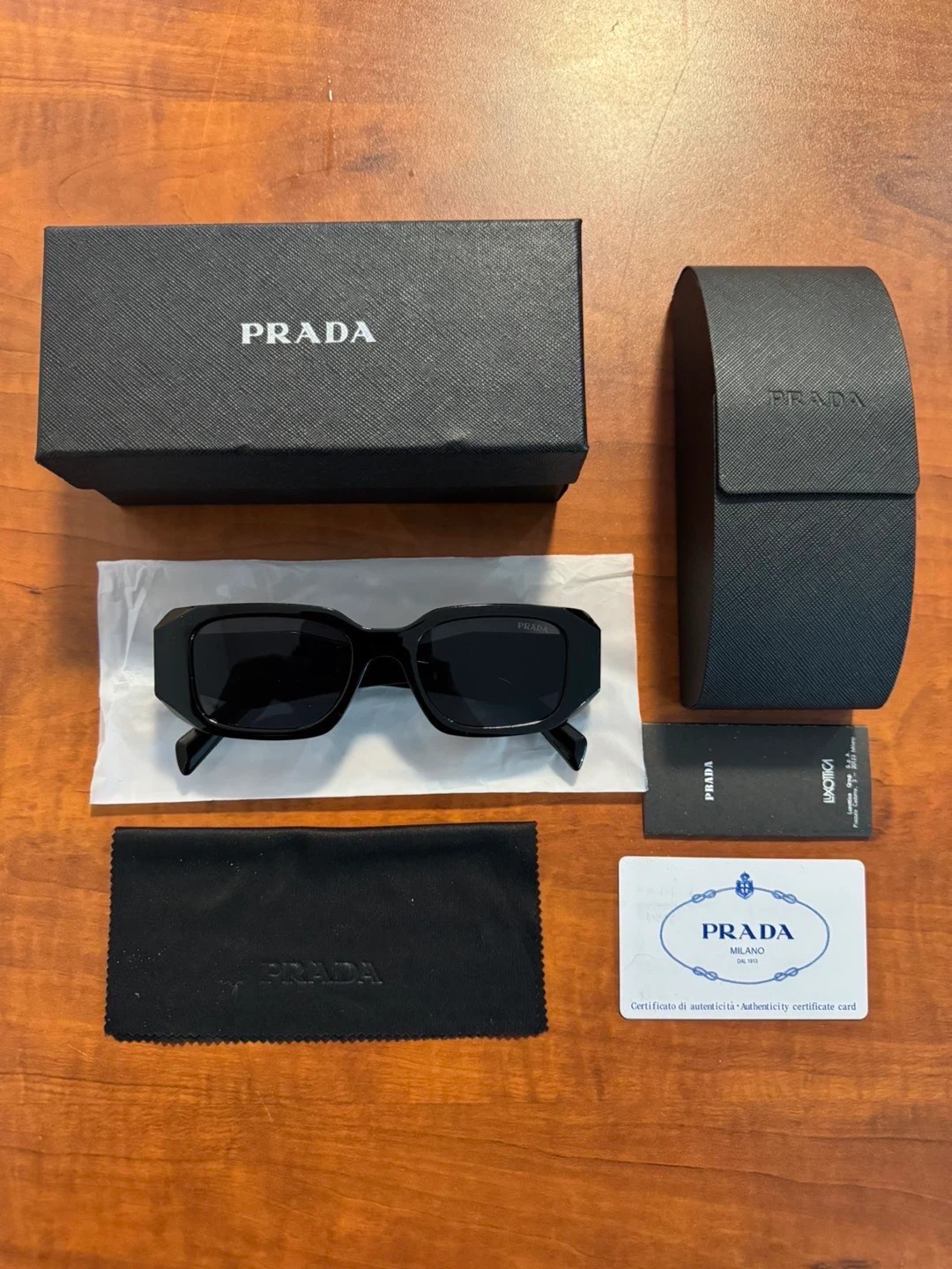 PRADA rectangular sunglasses in black. Comes with original box, case, cleaning cloth, and card. These sunglasses are a stylish accessory for any outfit.
