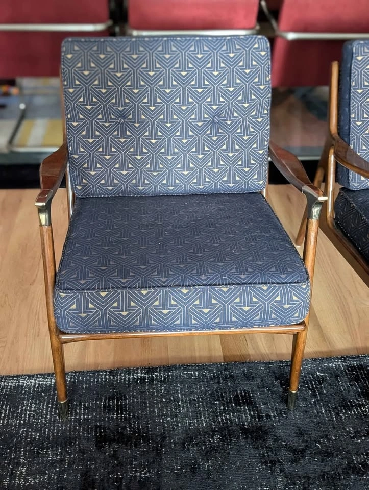 Reminiscent of Danish midcentury designs, this modern chair features a wide-set silhouette with tufted cushions upholstered in a soft cotton blend with a lustrous shine. A true form-follows-function piece, tapered brass accents protect the gleaming legs while lending the piece a refined elegance.