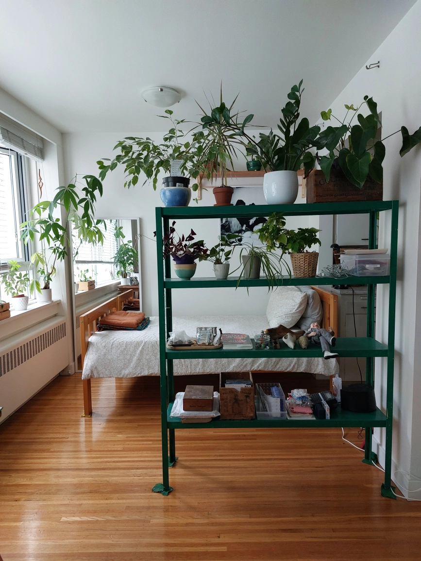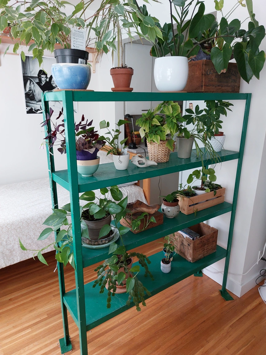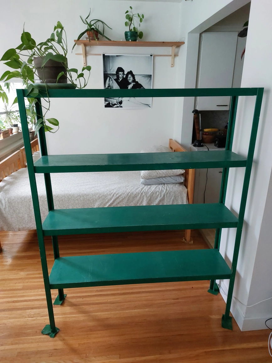 Vintage green metal shelving unit. Great for garages, basements, workshops, art studios, store merchandising, curated spaces and boho interiors.