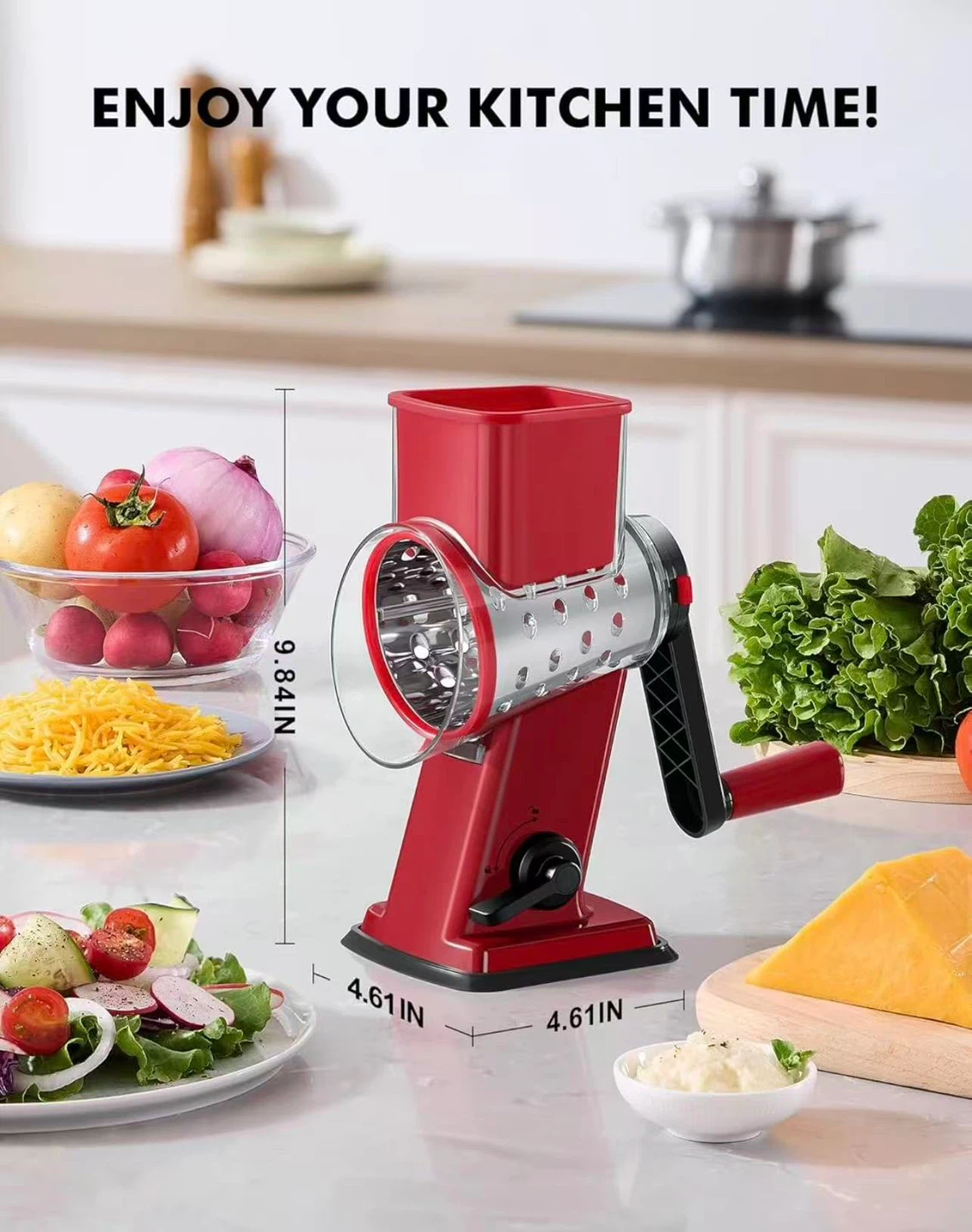 Rotary Cheese Grater Hand Crank - Upgraded Cheese Shredder with 4 Interchangeable Blades, Rotary Grater with Non-slip Suction Base, Easy to Clean Kitchen Grater Slicer Grinder for Vegetable Nuts