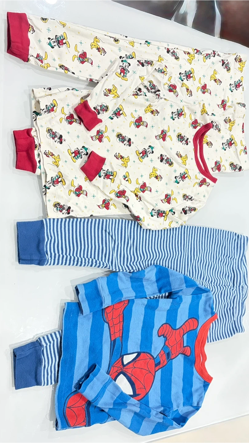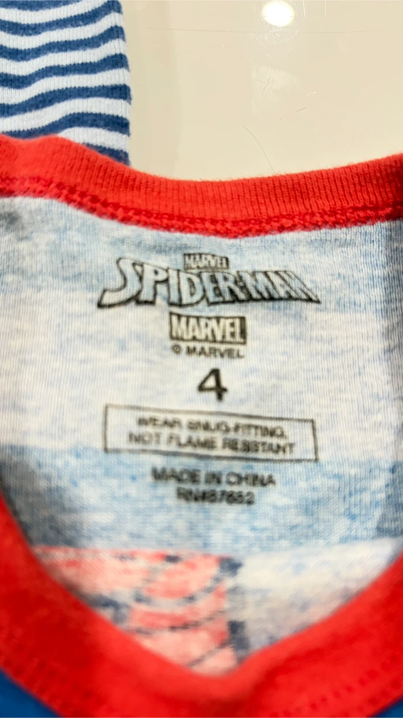 This set includes a Disney/Joe Fresh pajamas top with a Mickey Mouse holiday print and a Marvel Spider-Man pajama set. Both are size 4 and made from comfortable fabric.