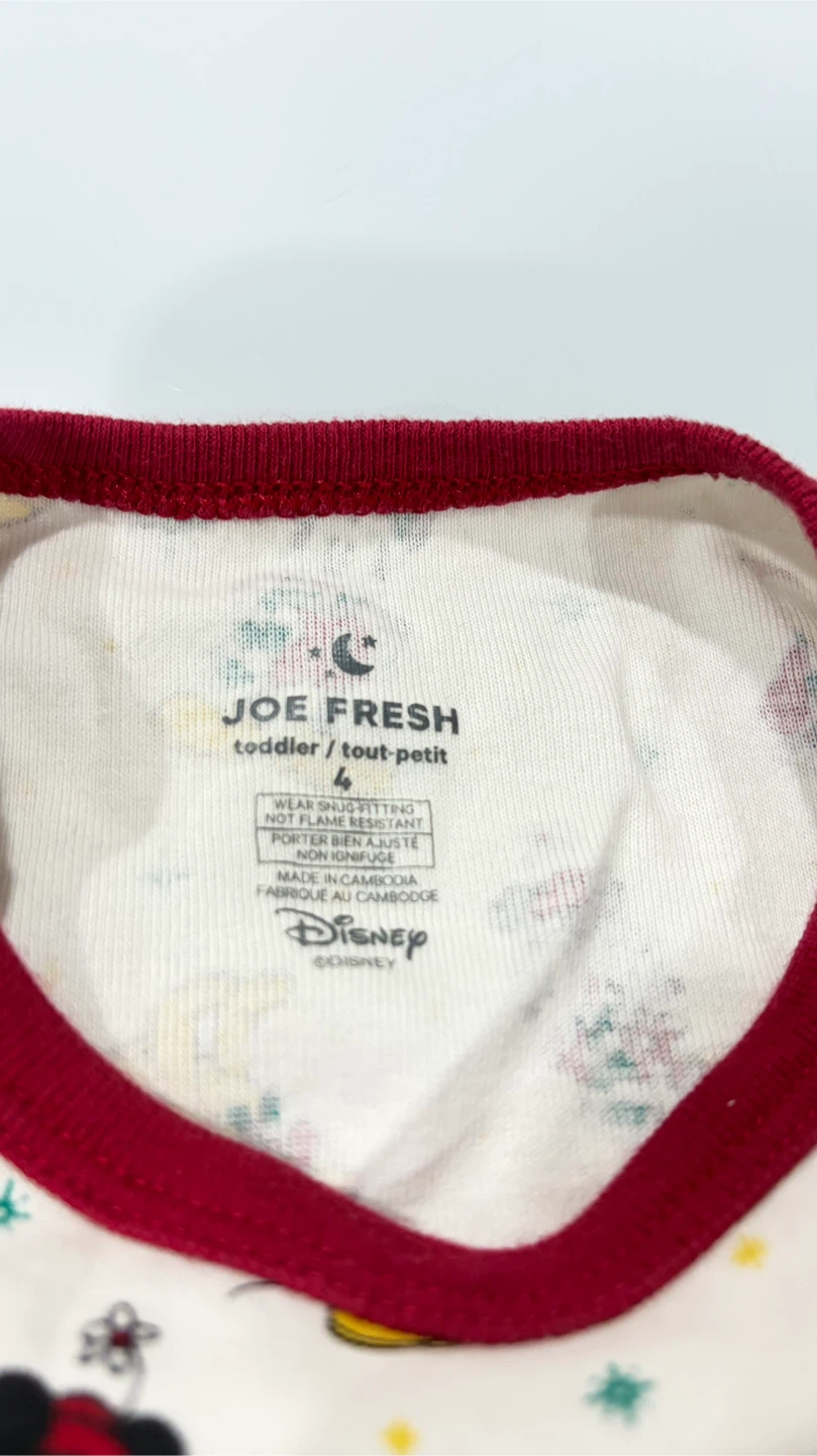 This set includes a Disney/Joe Fresh pajamas top with a Mickey Mouse holiday print and a Marvel Spider-Man pajama set. Both are size 4 and made from comfortable fabric.