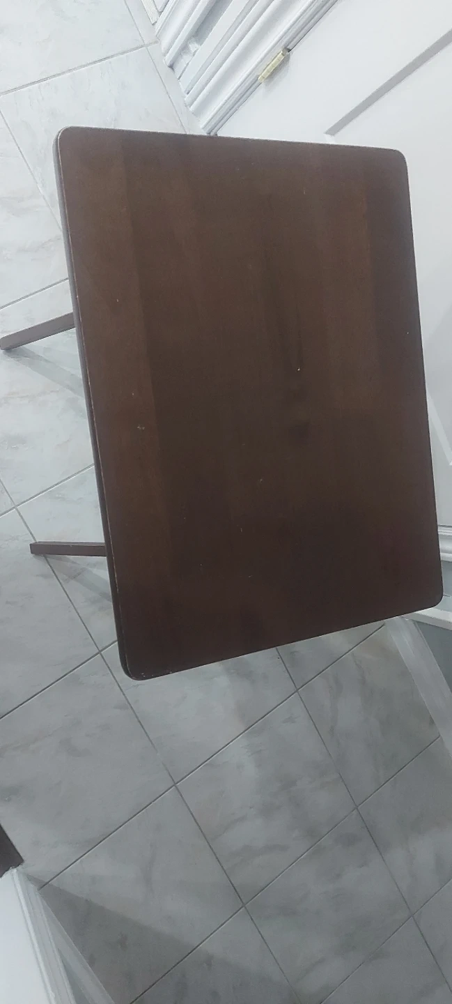This is a dark brown wooden table. It's foldable for easy storage. Its simple design makes it useful for snacks or drinks and decorations