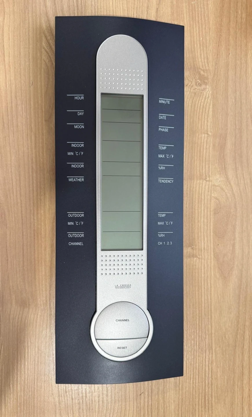 This La Crosse Technology weather station displays indoor and outdoor temperature and humidity. It also shows time, date, moon phase, and weather tendency.