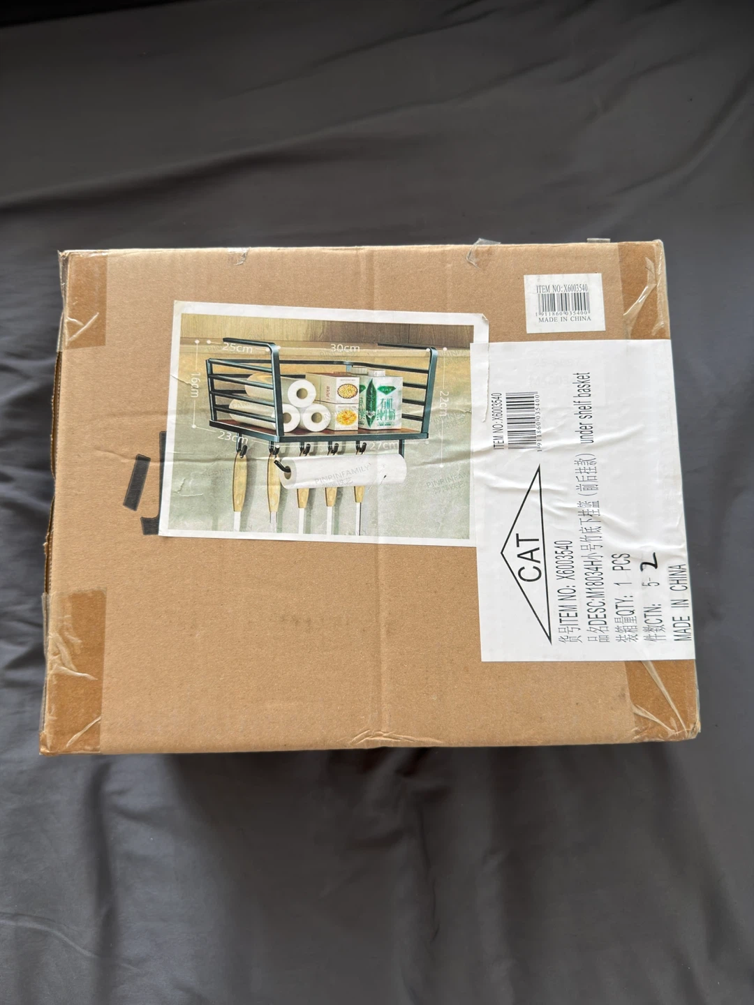 BNIB unused under shelf baskets with wooden base and metal supports.