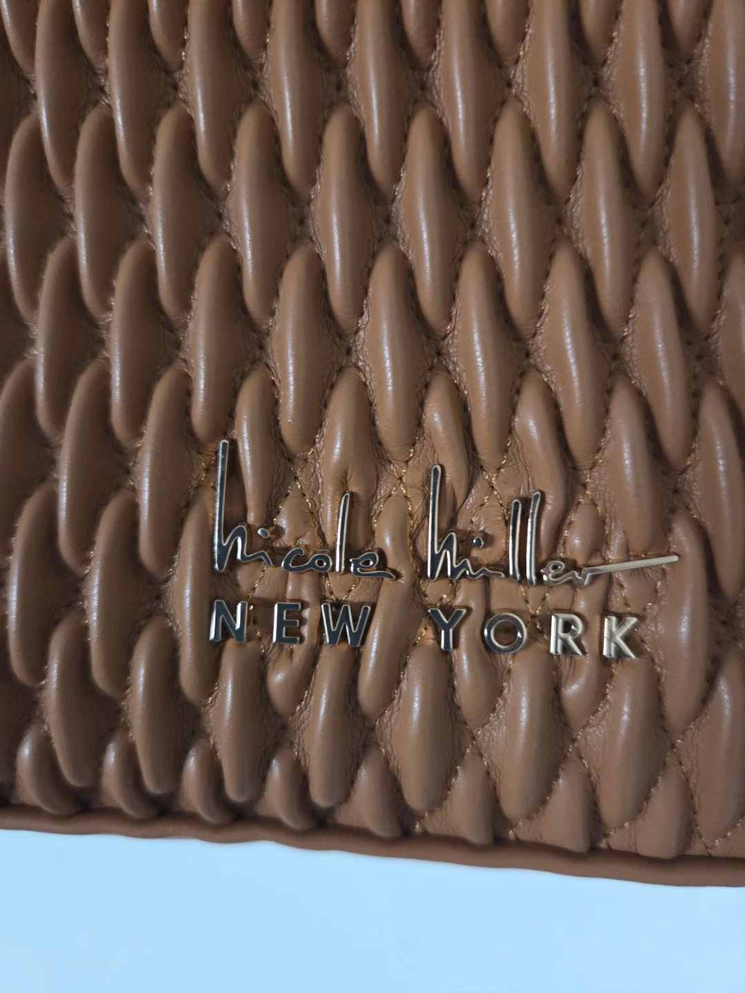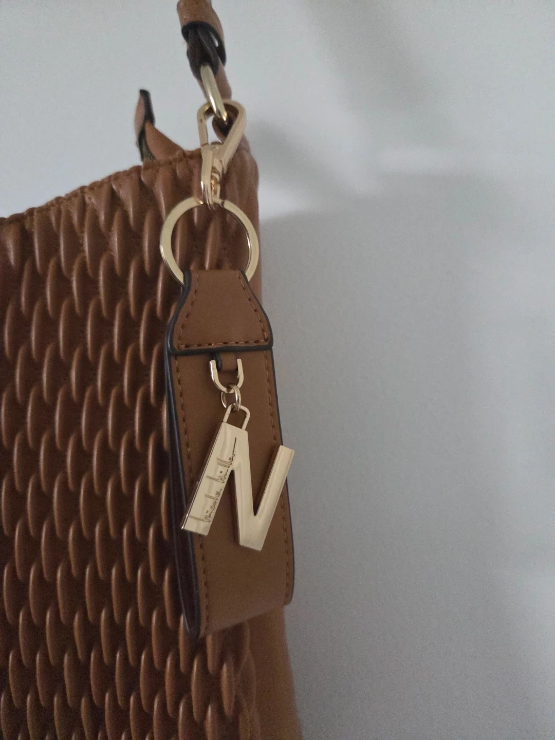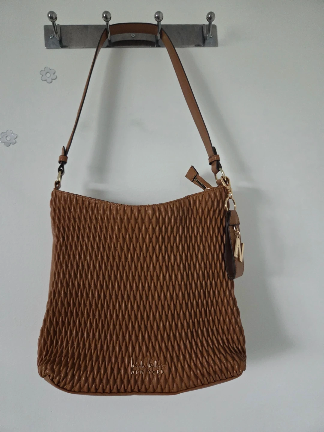 This is a Nicole Miller shoulder bag in a rich brown colour. It's made of a textured faux leather material and features a gold-tone "N" charm. The bag includes a long shoulder strap and a zippered closure.