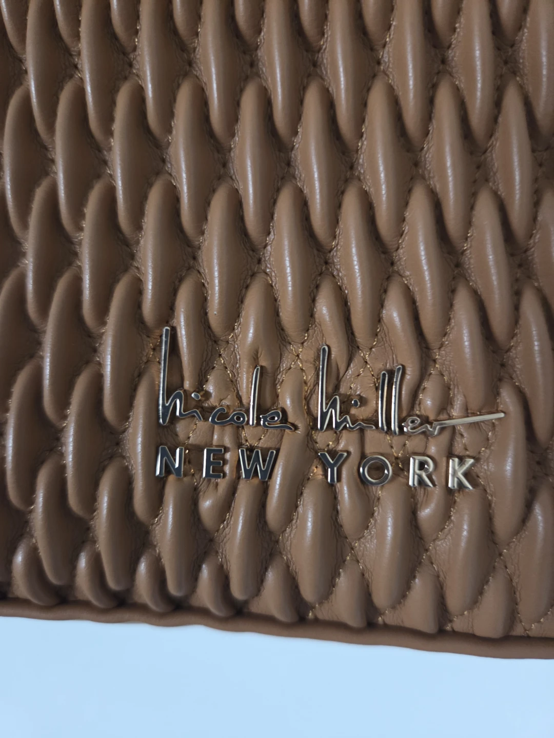 This is a Nicole Miller shoulder bag in a rich brown colour. It's made of a textured faux leather material and features a gold-tone "N" charm. The bag includes a long shoulder strap and a zippered closure.