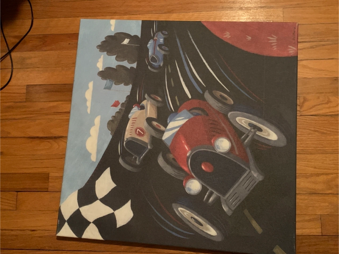 This canvas art depicts a vintage-style race scene with checkered flags and classic cars. It's perfect for adding a touch of retro charm to any room. The artwork is printed on canvas and ready to hang.