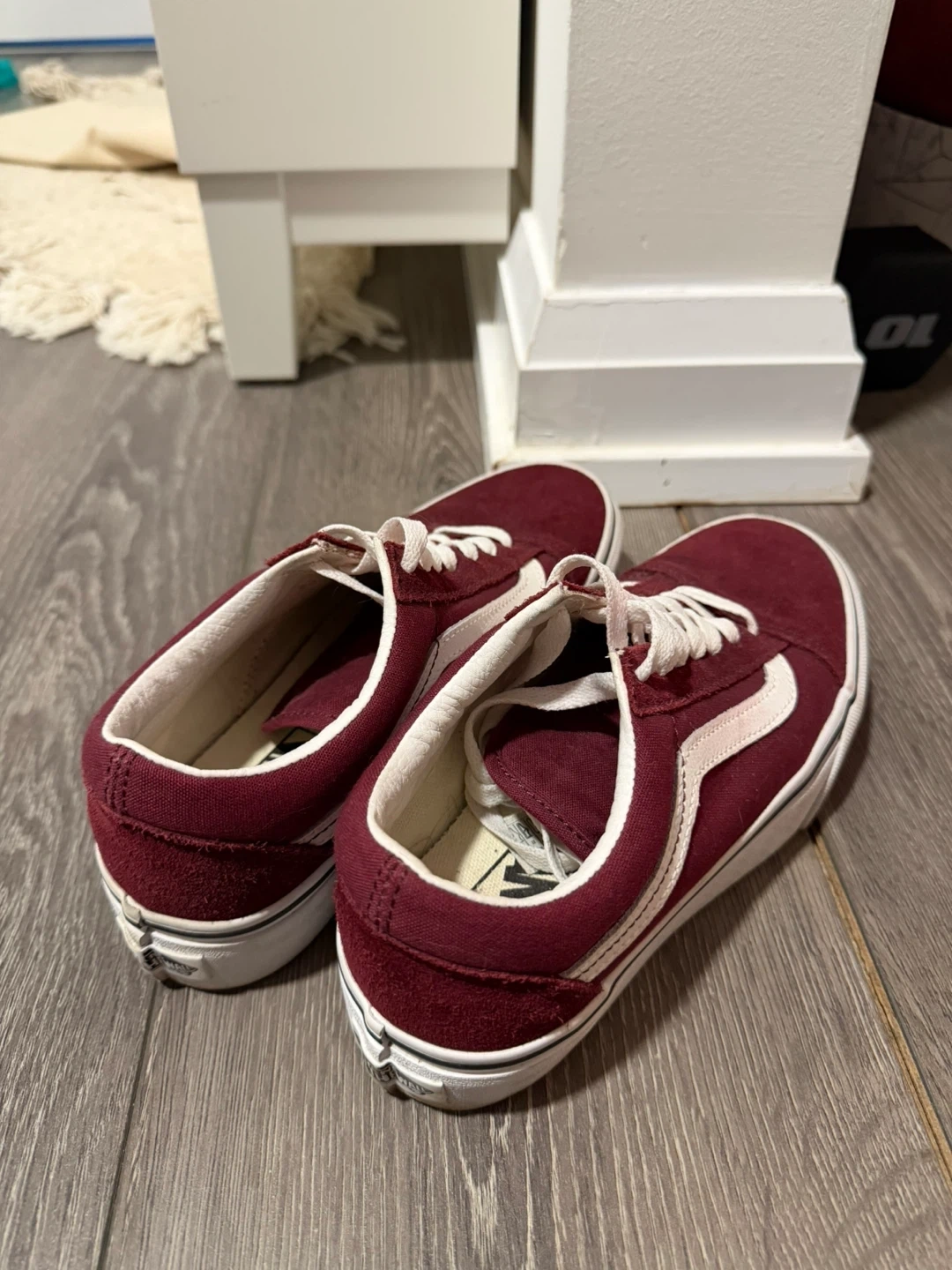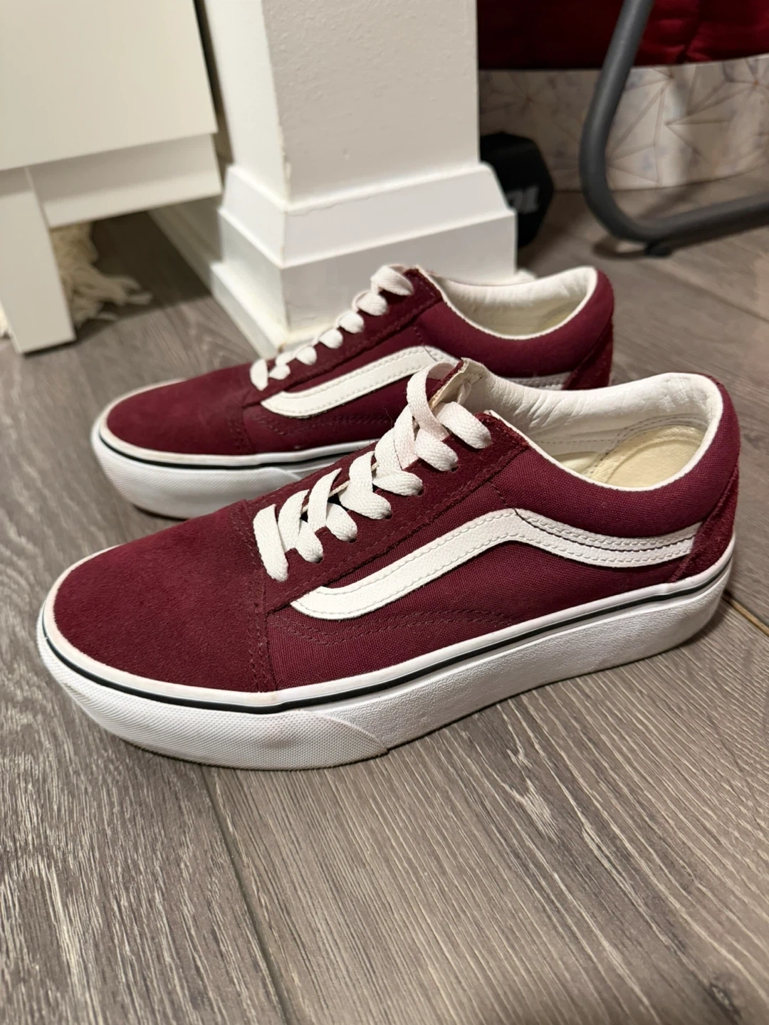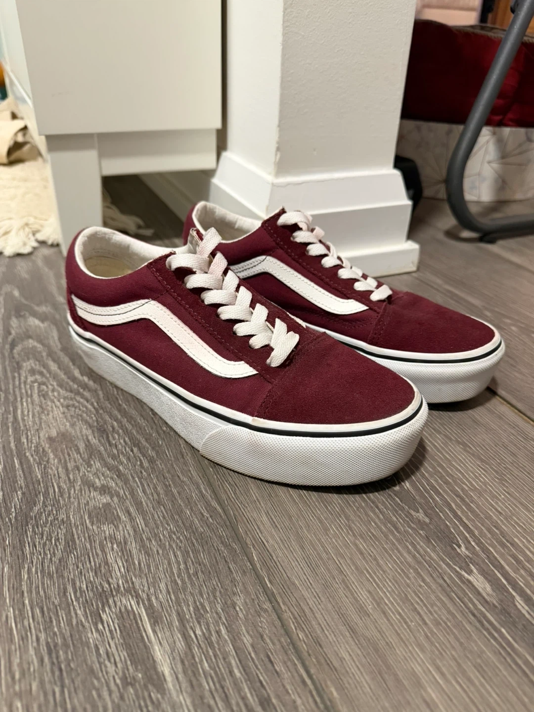 Classic Vans Old Skool sneakers in a deep burgundy colour. Suede and canvas upper with signature white side stripe. White laces and rubber sole. Women’s size 6.5.
