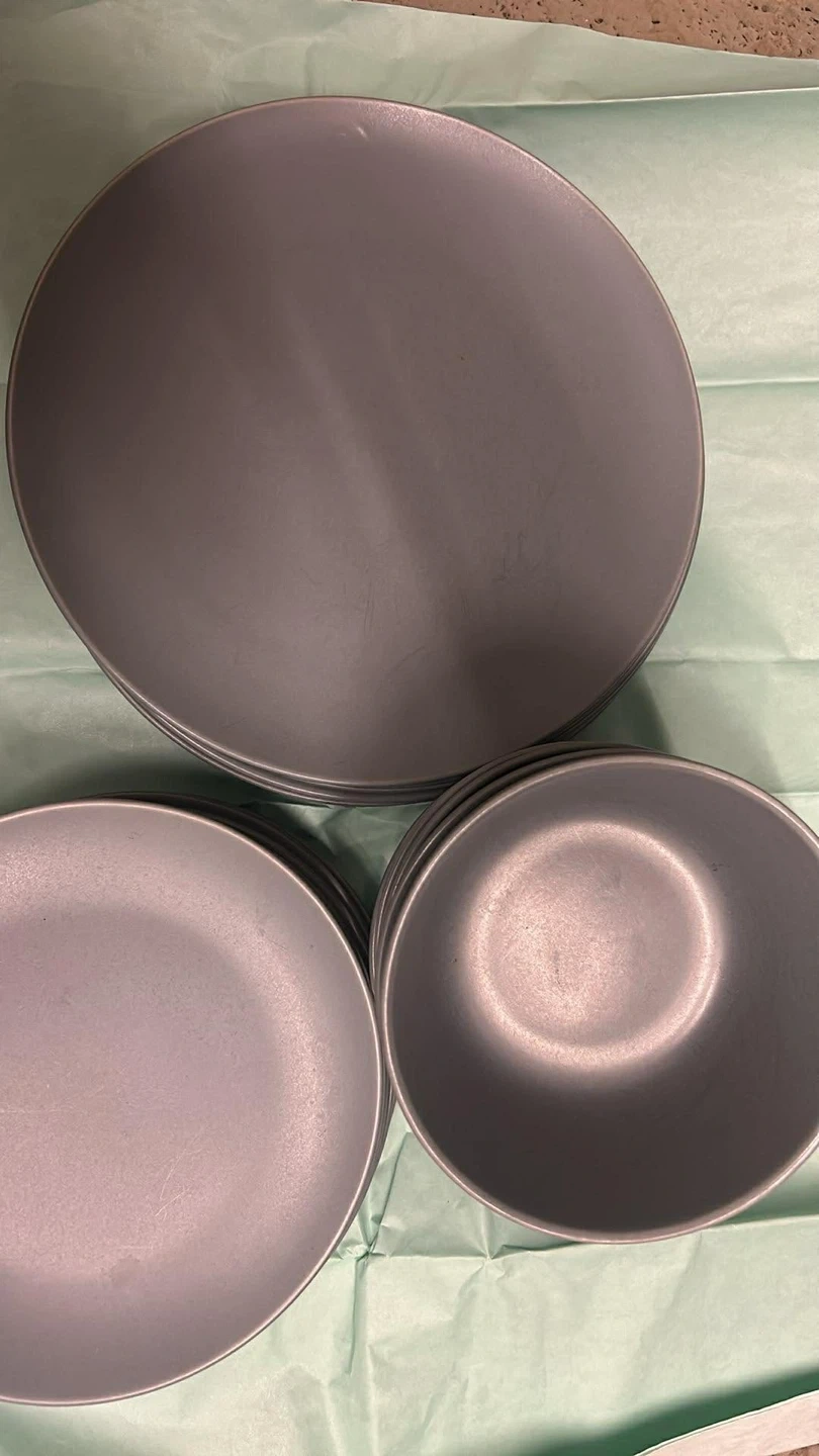 This is a set of grey dinner plates and bowls. They are made of a durable material. This set would be useful for everyday dining.