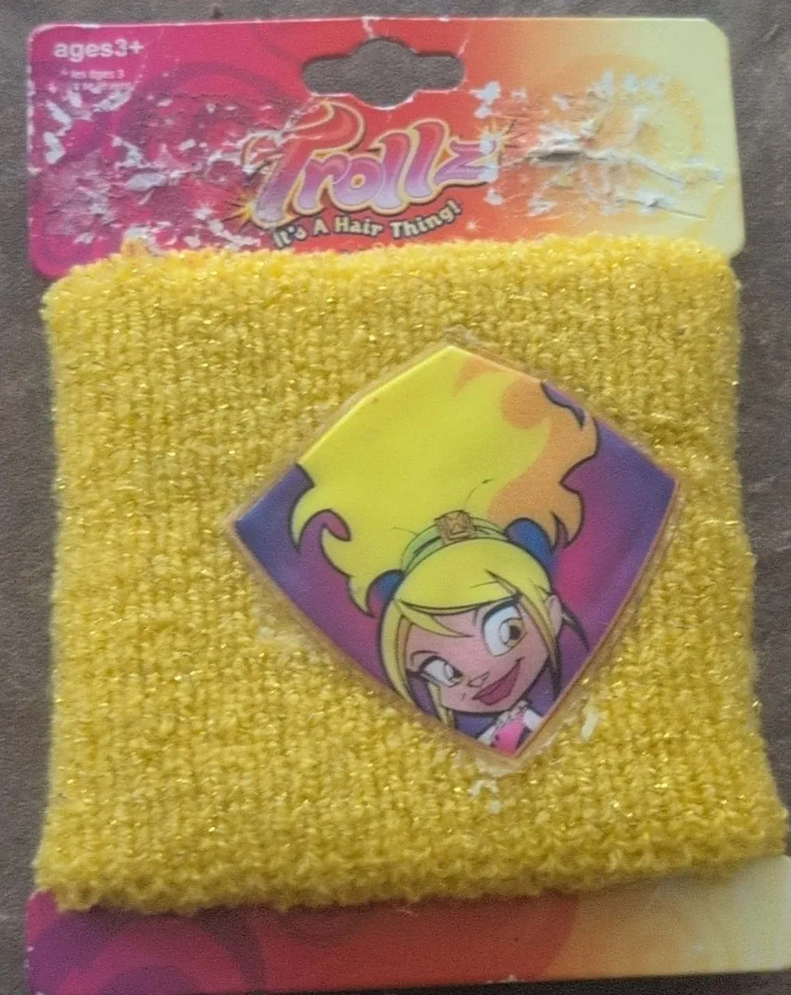 This is a yellow hair accessory from the Trolls movie, featuring a character graphic. It's suitable for ages 3 and up. The material appears to be a soft, sparkly fabric.