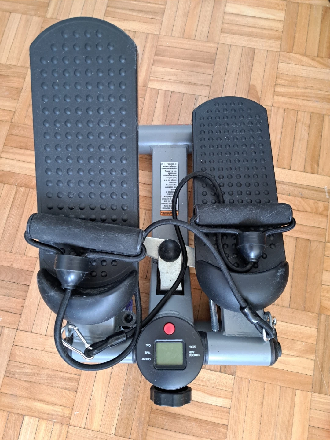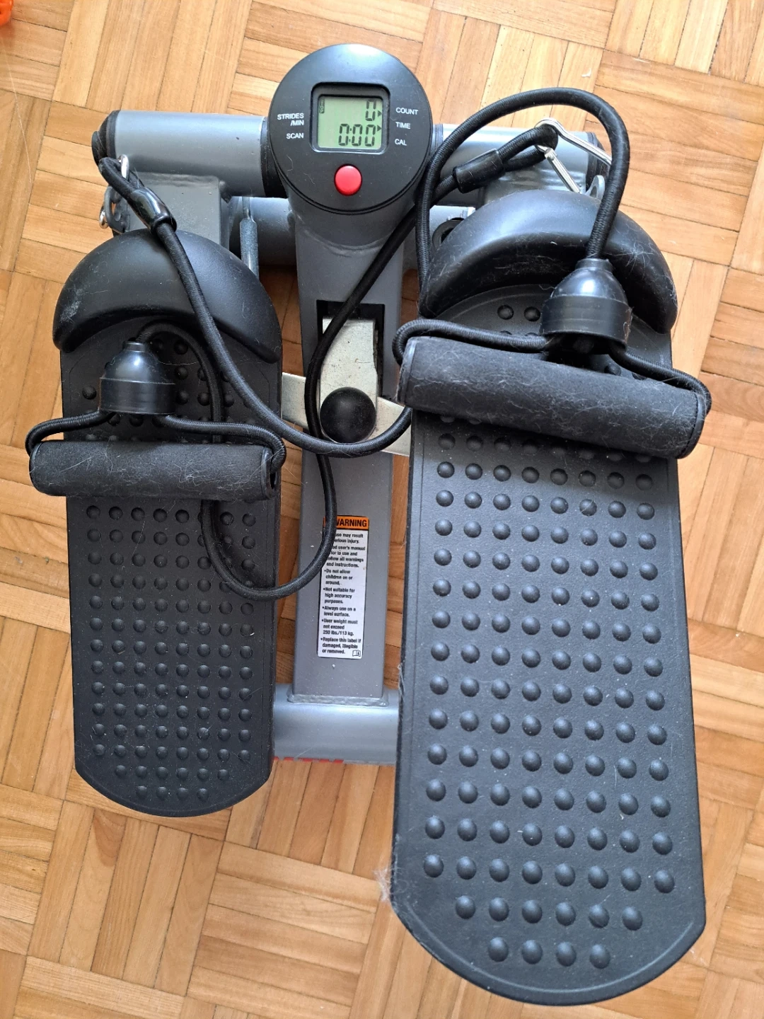 This mini stair stepper offers a compact workout solution with integrated resistance bands for upper body engagement. It features an LCD display that tracks steps, time, and calories burned. Perfect for home use, it provides an efficient cardio and strength training opportunity.π