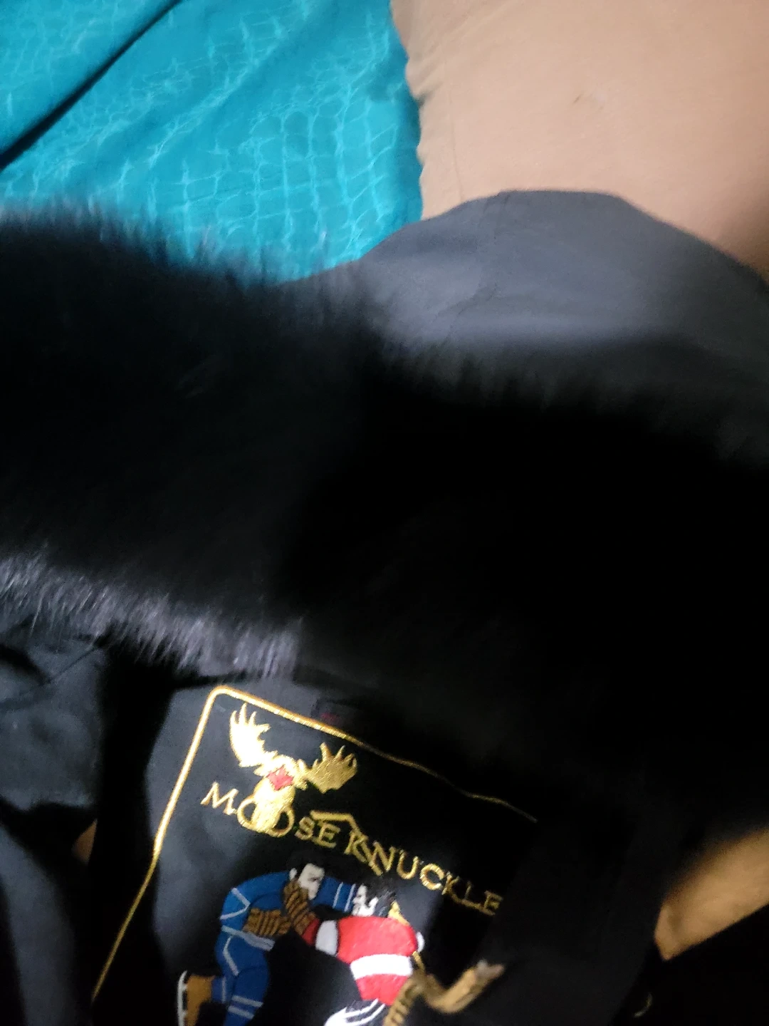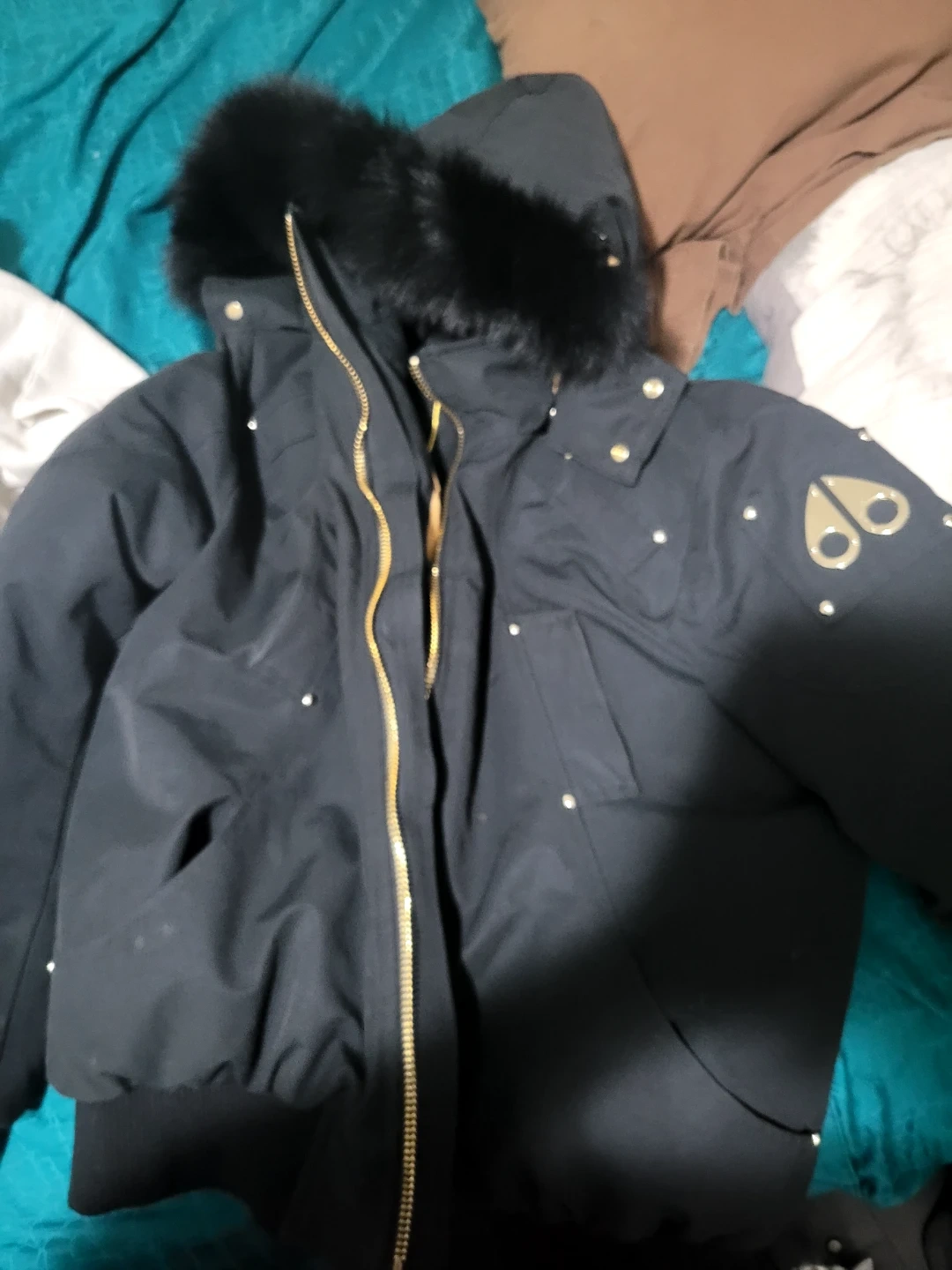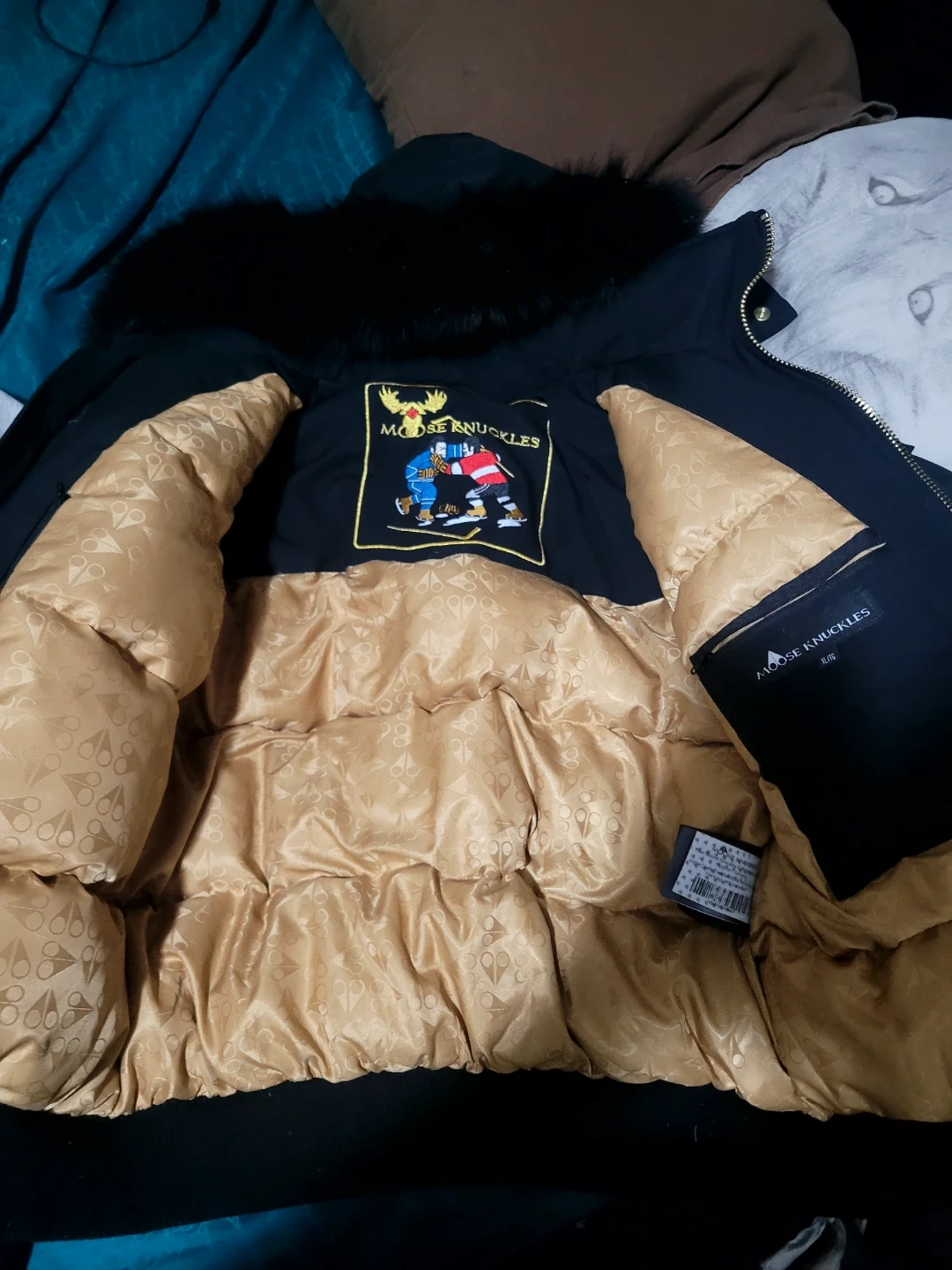 Black Moose Knuckles bomber jacket with a black fur-lined hood. It's a warm and stylish winter coat. This jacket features the iconic Moose Knuckles logo details. It's designed for cold weather.
