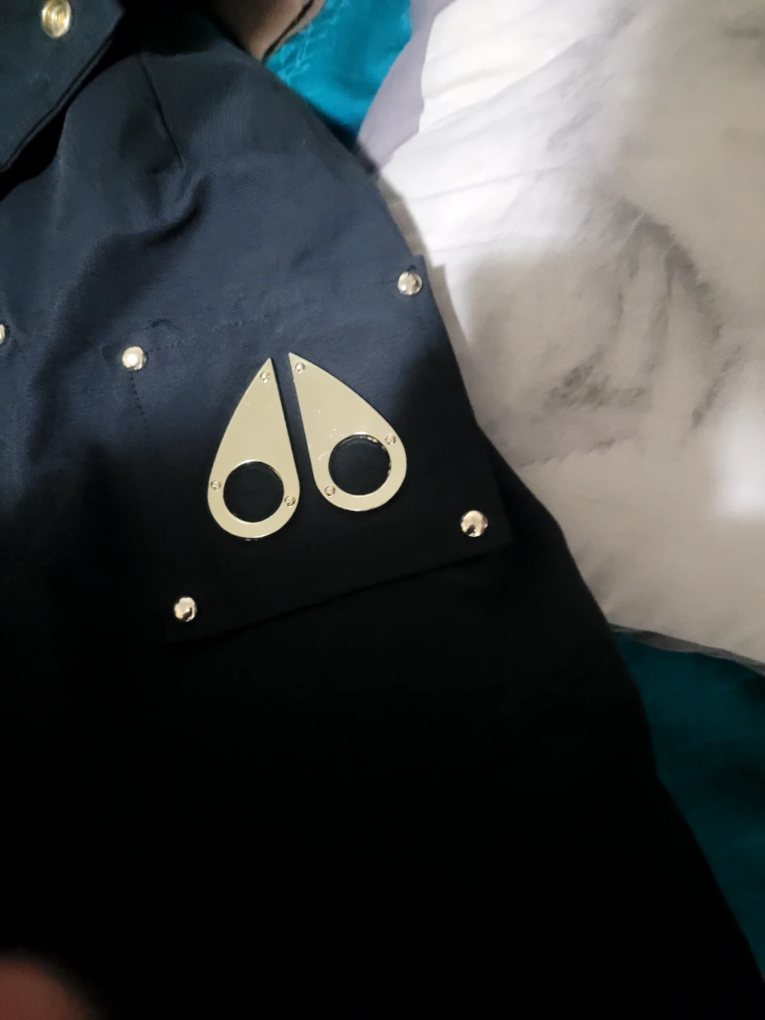 Black Moose Knuckles bomber jacket with a black fur-lined hood. It's a warm and stylish winter coat. This jacket features the iconic Moose Knuckles logo details. It's designed for cold weather.