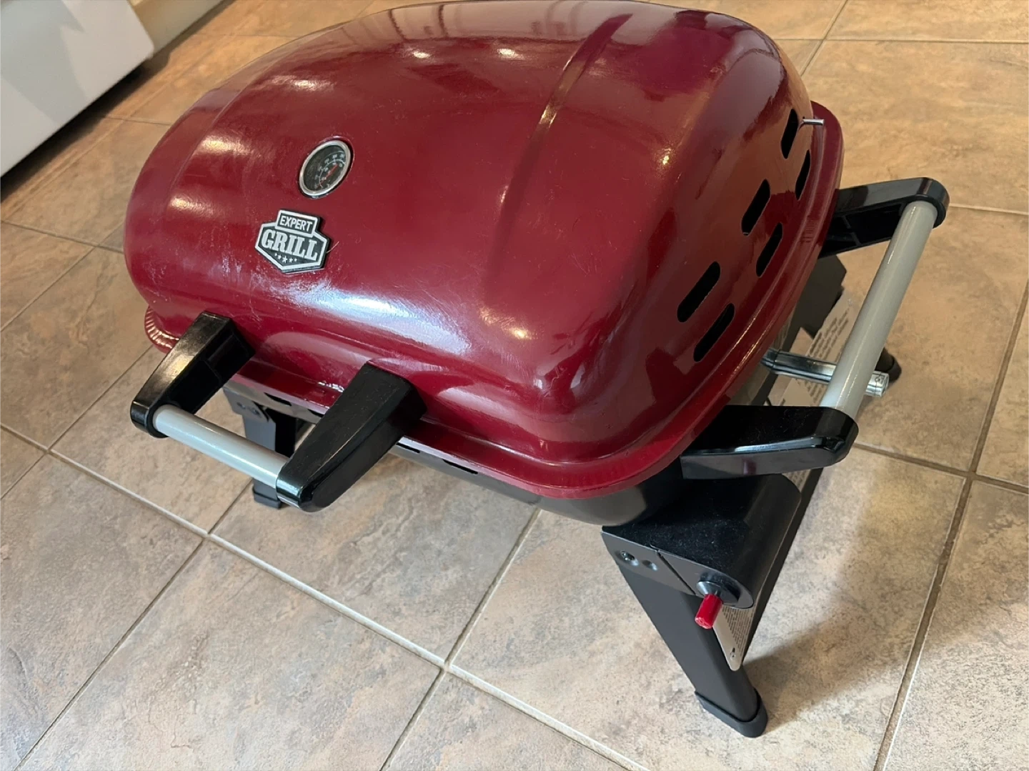 Expert Grill portable propane gas grill in red. It's compact and easy to transport. Great for camping trips or tailgating events!
