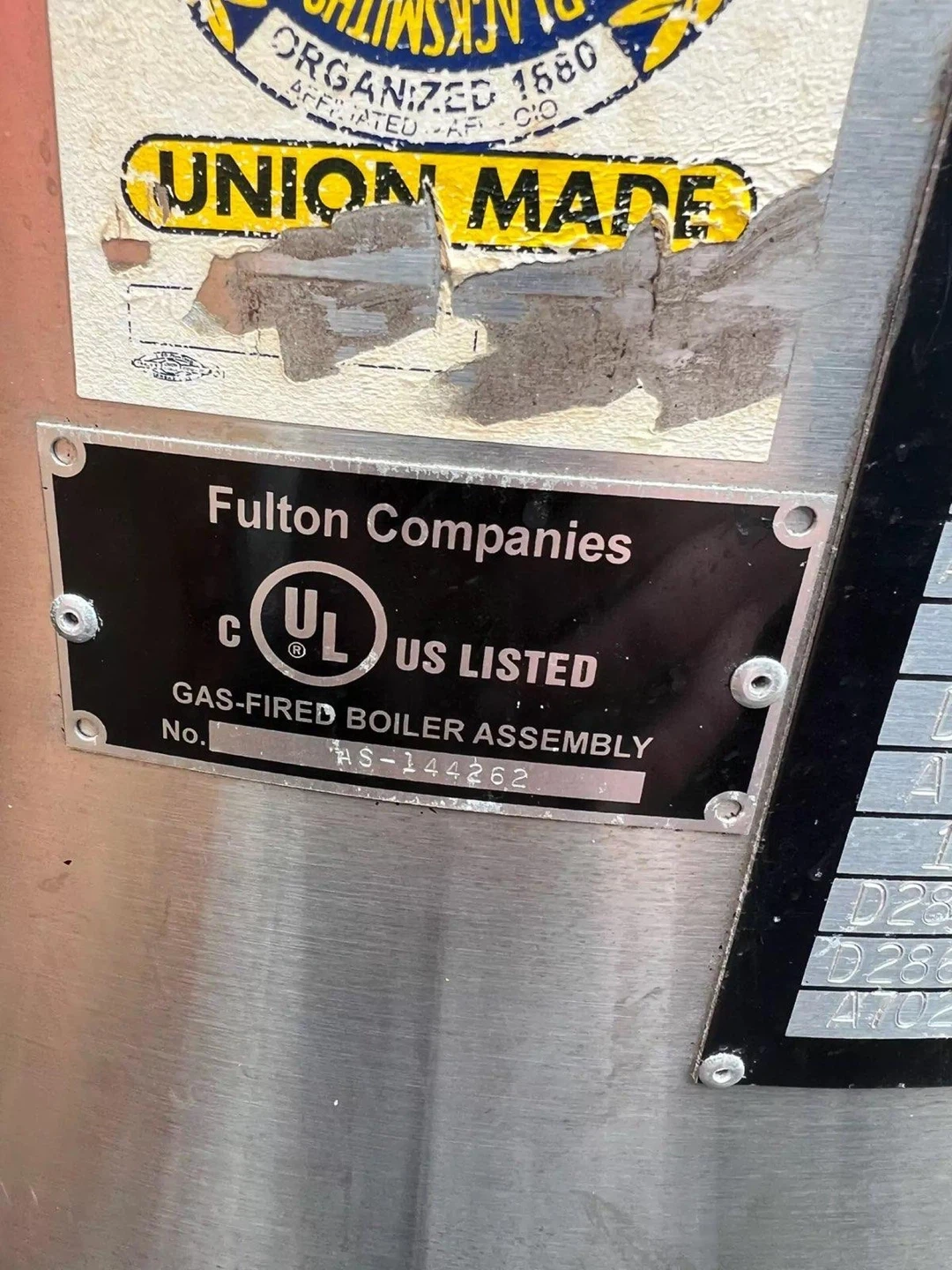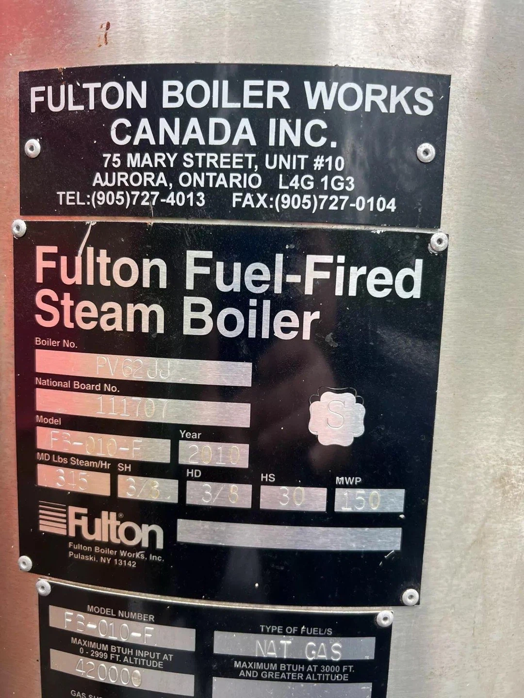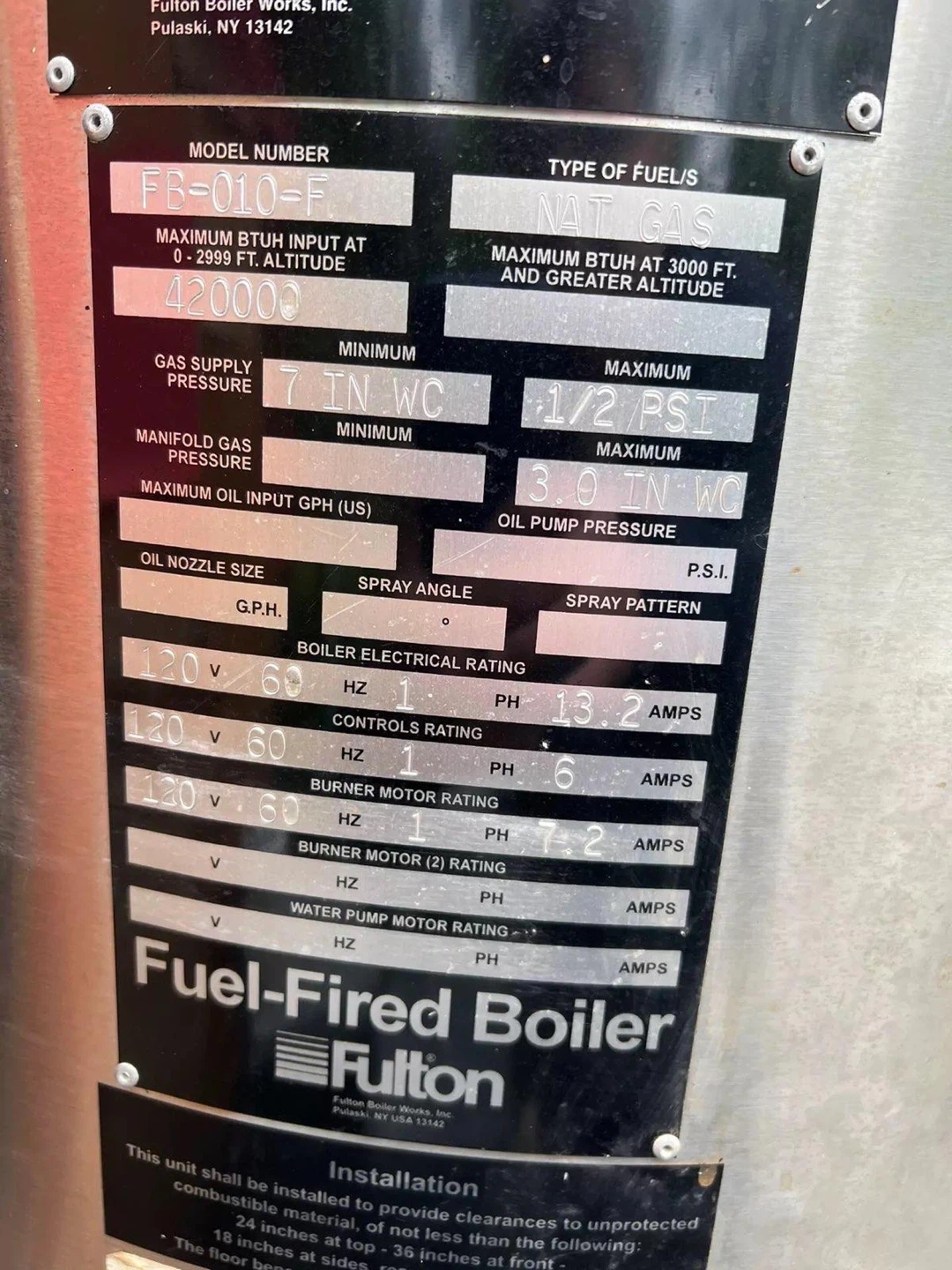 Fulton Fuel-Fired Steam Boiler, model FB-010-F. Type of fuel is natural gas. Maximum BTUH input is 420,000 at 2999 ft. altitude. Boiler electrical rating is 120V, 13.2 AMPS.