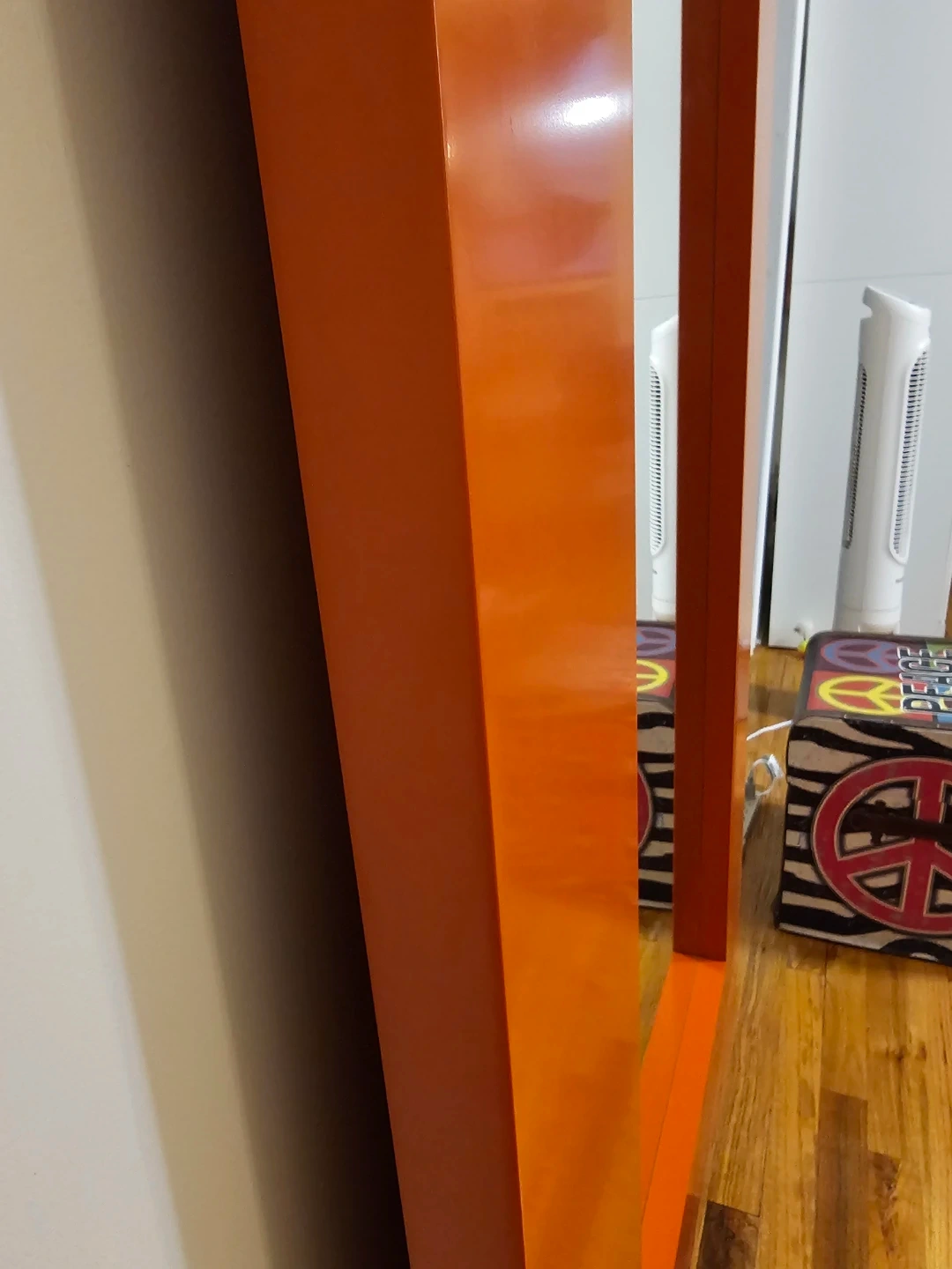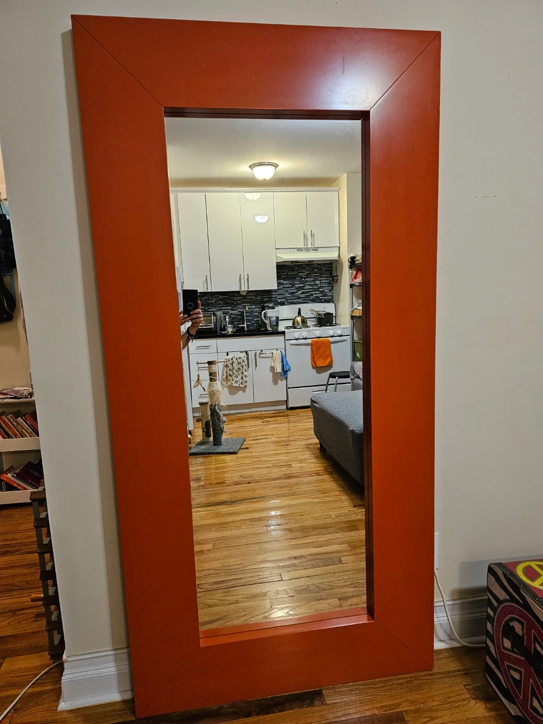 A large full-length mirror with a vibrant orange frame. It's perfect for checking your outfit or brightening up a room. The frame is made of sturdy wood. 37" height, 74" length, 2" width. Cat not included.