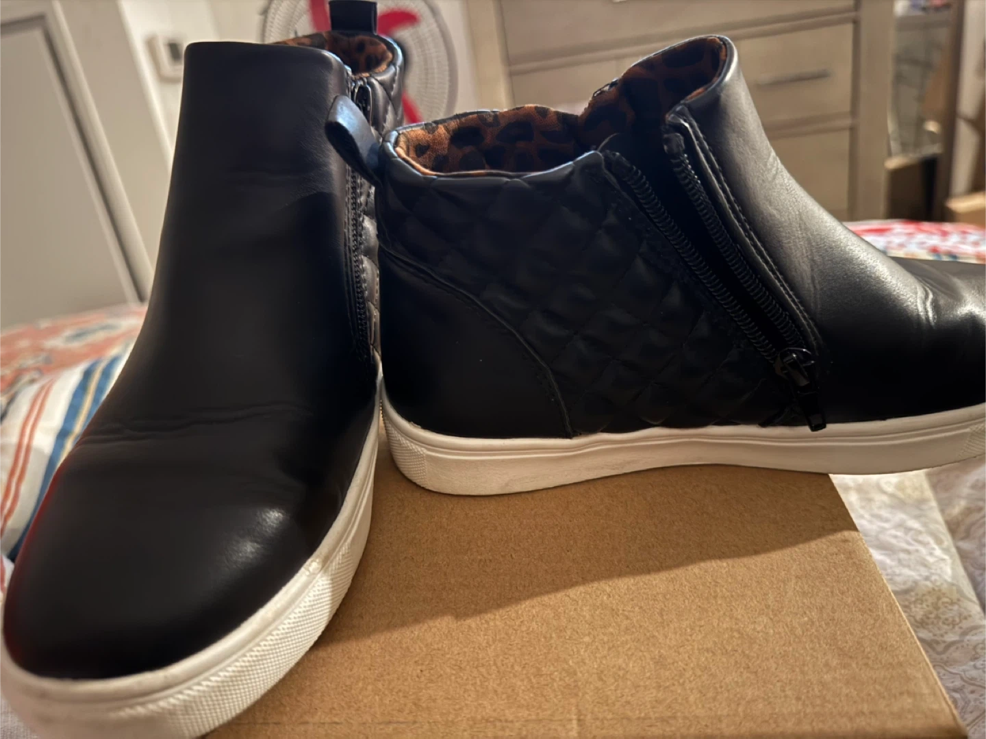 Selling a pair of Steve Madden JReggie zippered black ankle booties size 3Y big girl that features a quilted design. The inside lining is leopard textile and The outsole is leather.