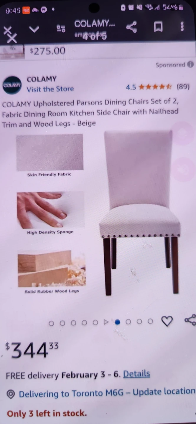 Set of two COLAMY upholstered Parsons dining chairs. Features fabric upholstery with nailhead trim and solid rubber wood legs. High-density sponge padding offers comfort.