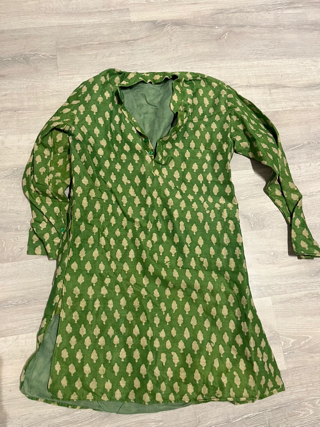 Long-sleeved green kurta. Features a button closure and all-over tree print. Relaxed fit.