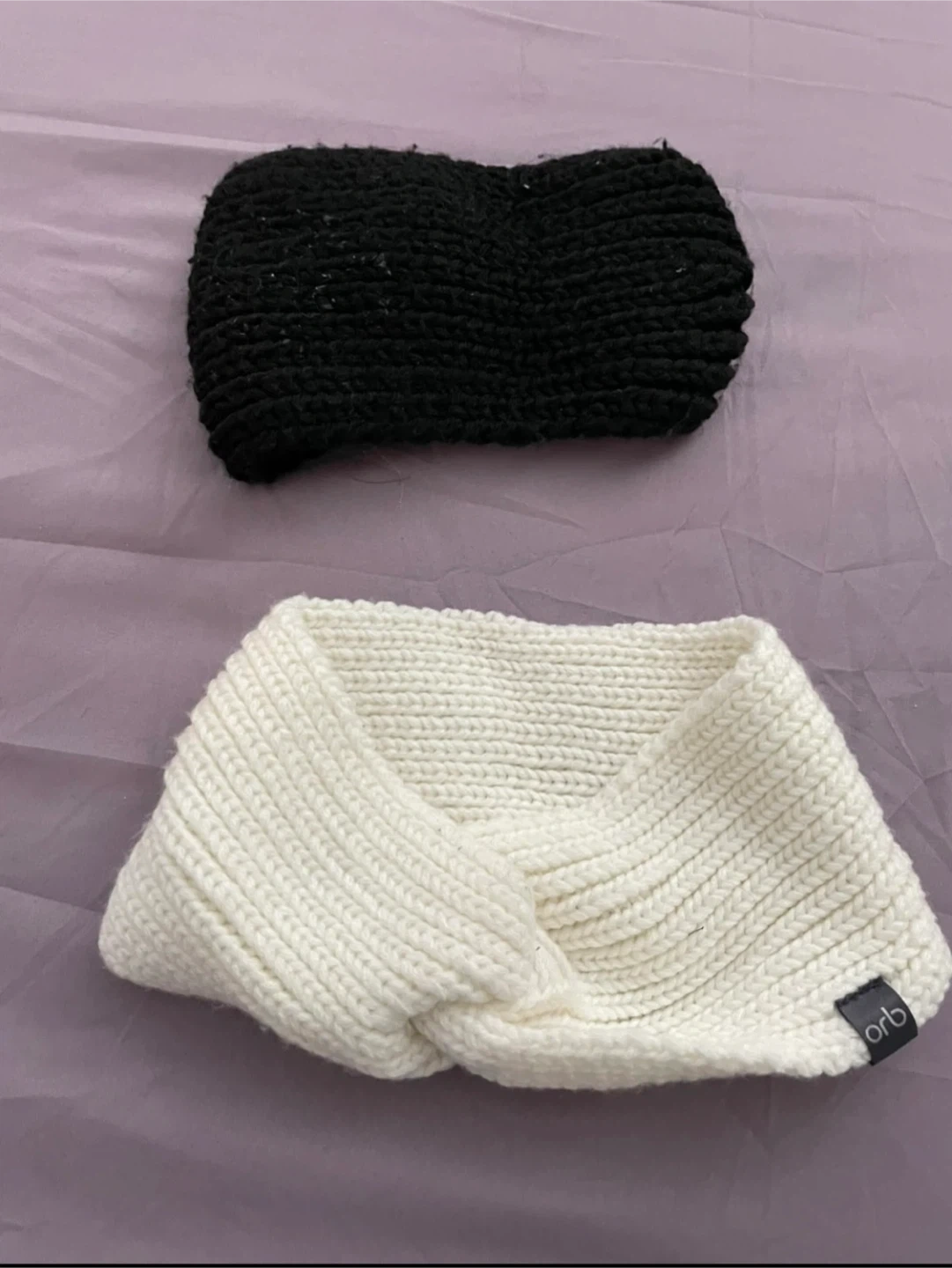 Selling a set of two knitted ear warmer headbands. One is black with a wooden button detail, and the other is cream-coloured with a twisted knot design. Both are made of a soft knit material, perfect for keeping ears warm on chilly days.