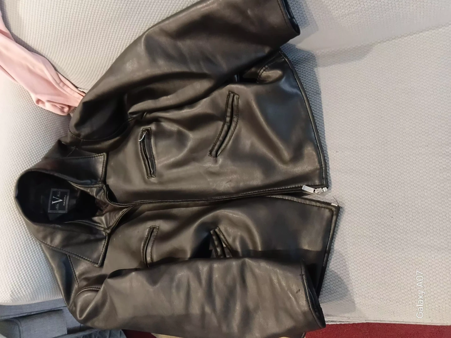 Classic black faux leather jacket with a zip-up front and zippered pockets. It's a stylish outerwear piece. Faux leather material.