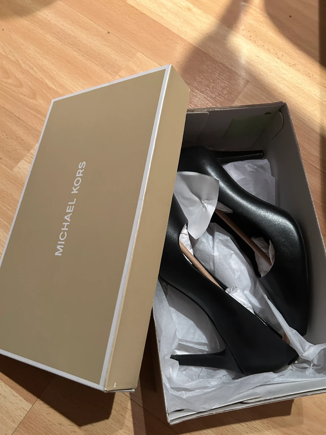 These Michael Kors heels are a classic black colour. They come in their original box. These pumps have a stiletto heel. Not a high heel person, only wore once for a good friend’s wedding.