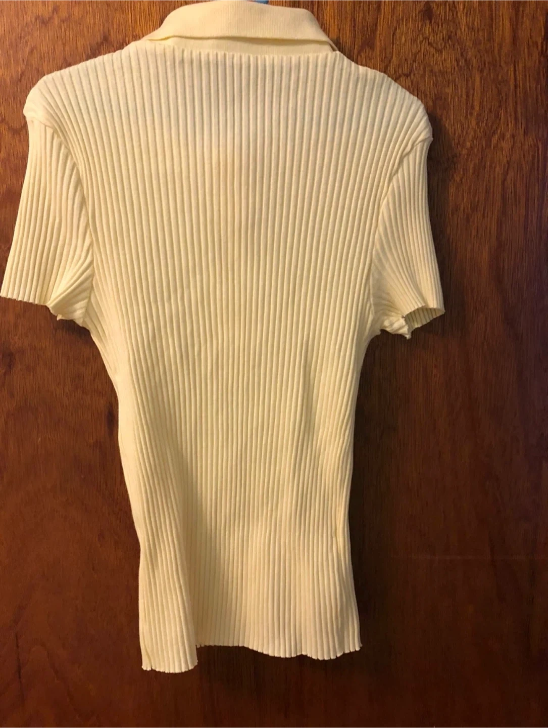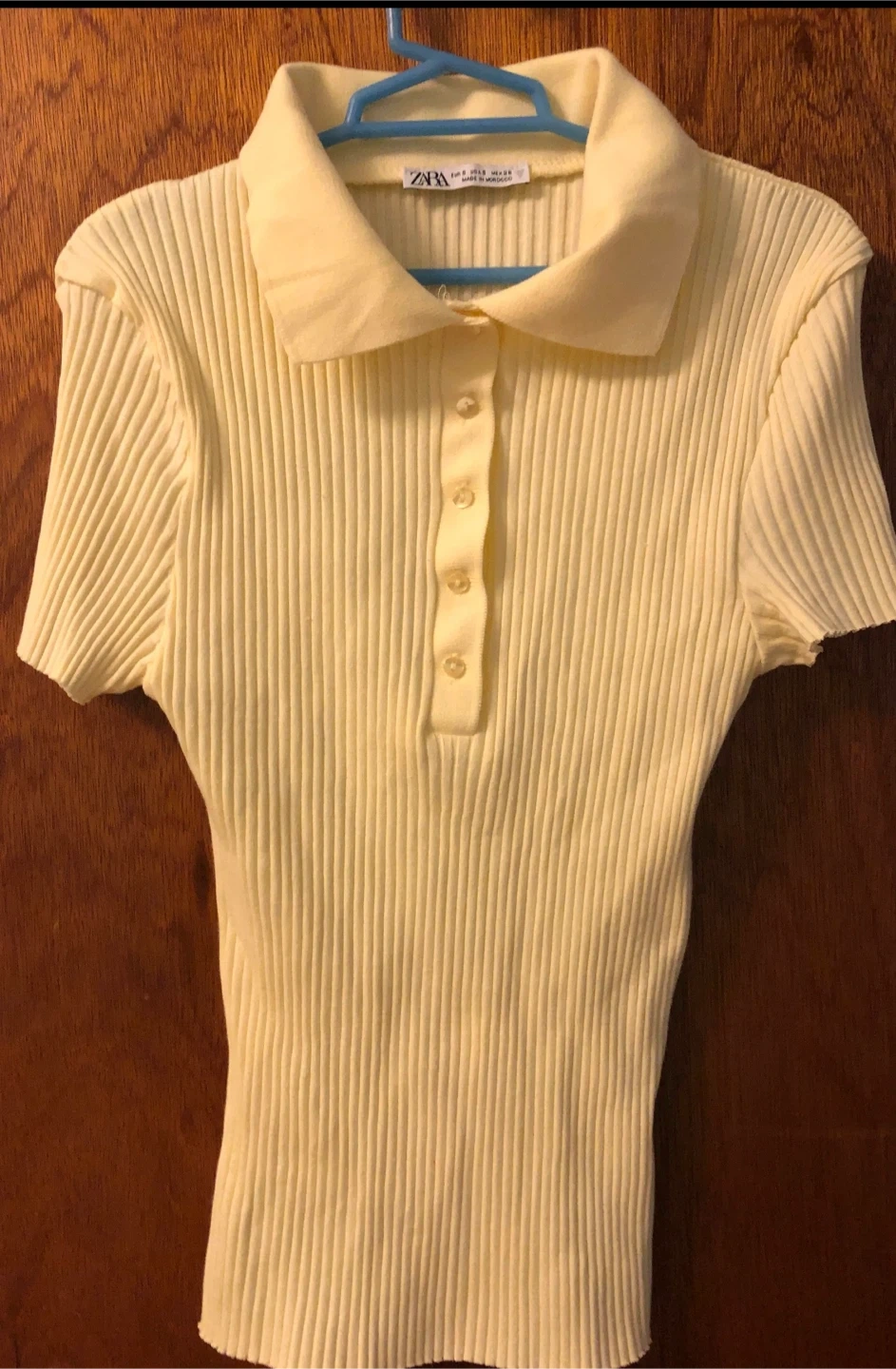 A cute light yellow stretchable ribbed collared shirt from ZARA. It features a button-up neckline and short sleeves. Made in Morocco, size S.