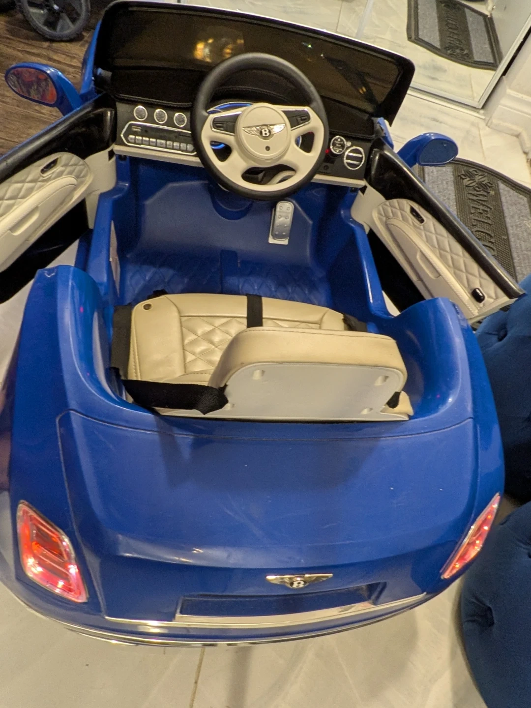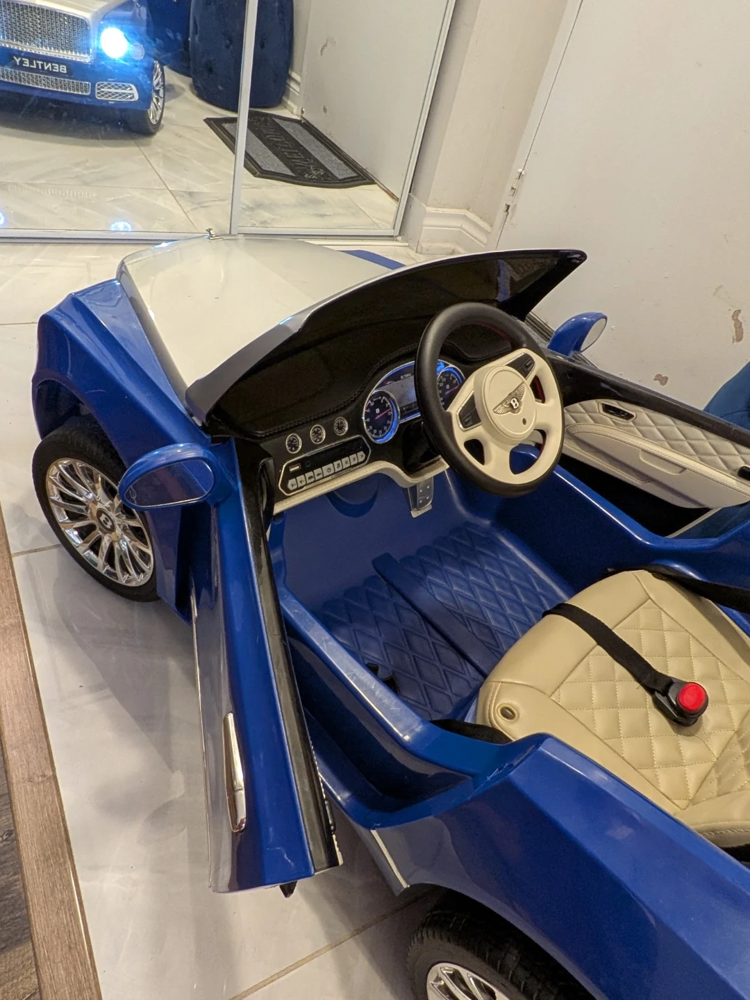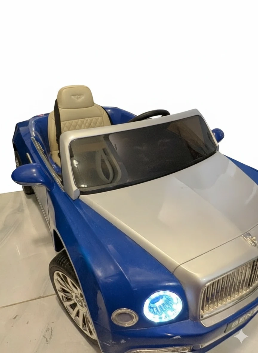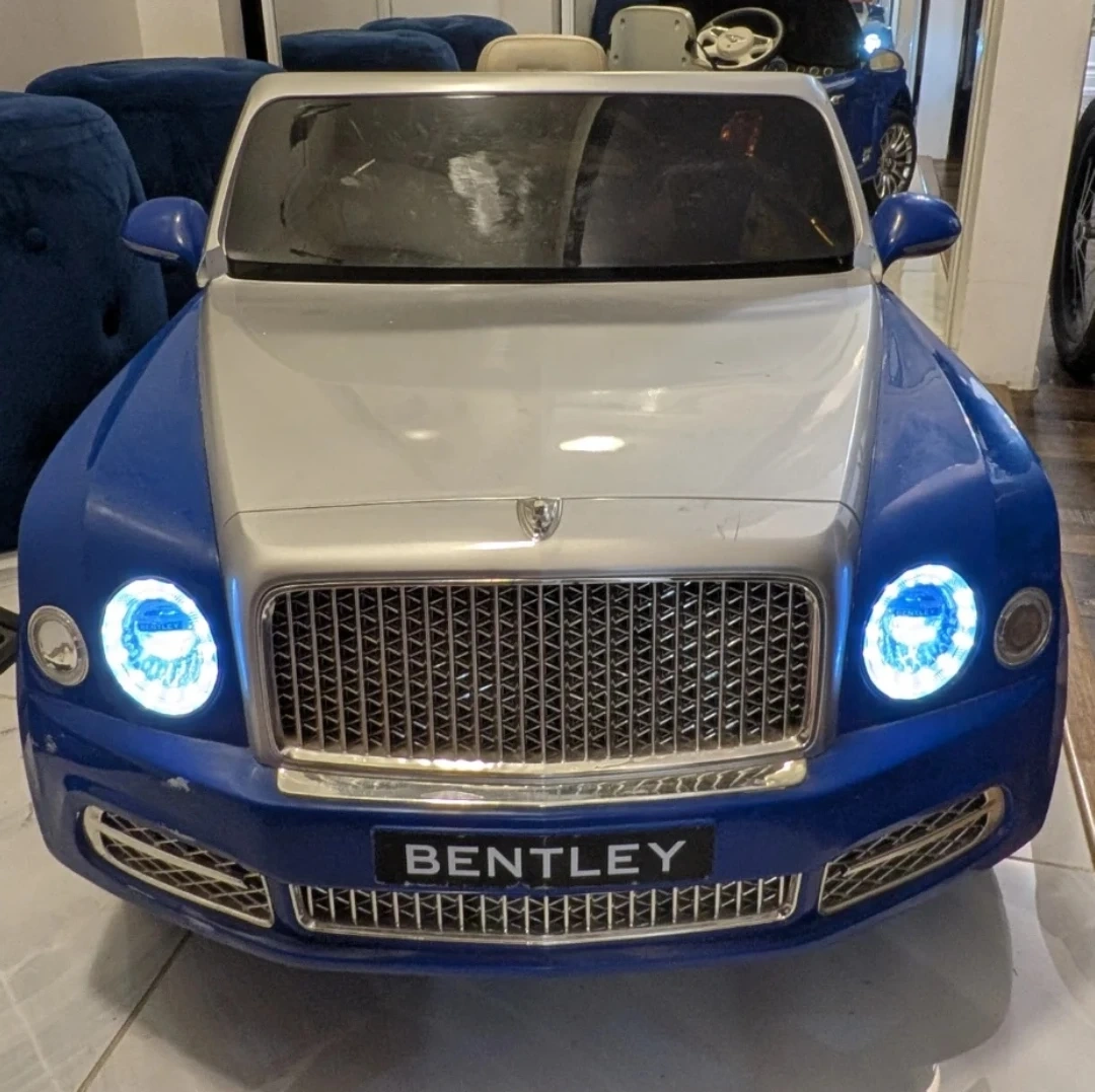 A stunning Bentley kids ride-on car in a beautiful blue and silver combination. This meticulously maintained car is in pristine condition, having been only used indoors, ensuring a perfect working order. It's a rechargeable car complete with a remote control and a charger. While it has been used, there are only some unnoticeable wear and tear marks on the car. Give your child the joy of luxury and make every ride an unforgettable adventure! Interested buyers, contact now! Your little one enjoy ride on it....
