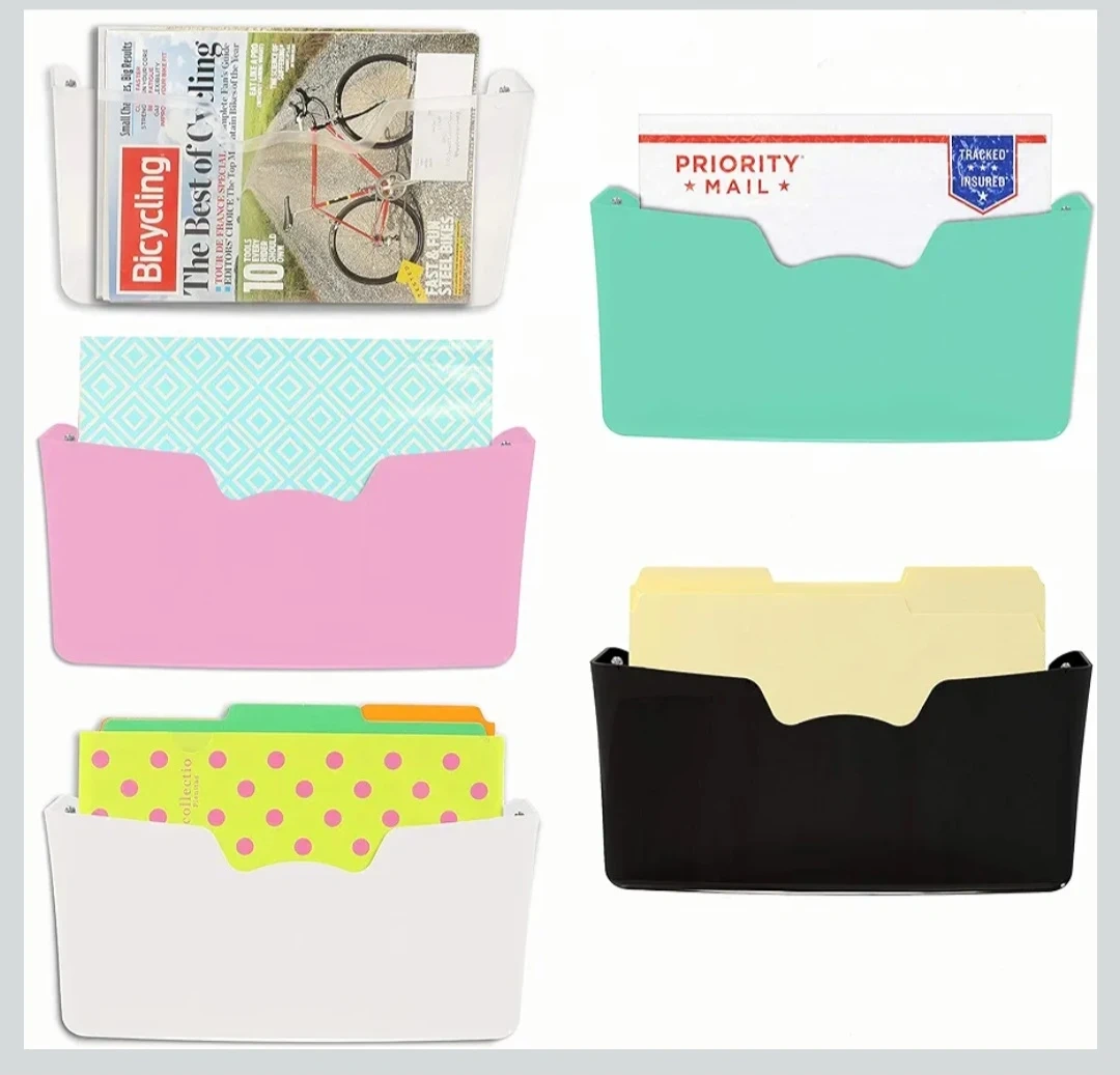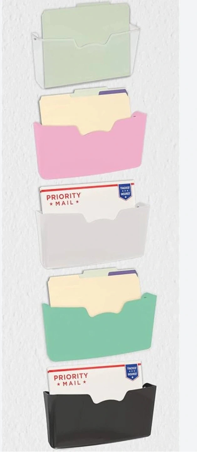 This set includes five wall file holders in assorted colours. Each holder measures 13.75" wide, 6.75" high, and 3.4" deep. They're perfect for organizing mail, magazines, or documents at home or in the office.