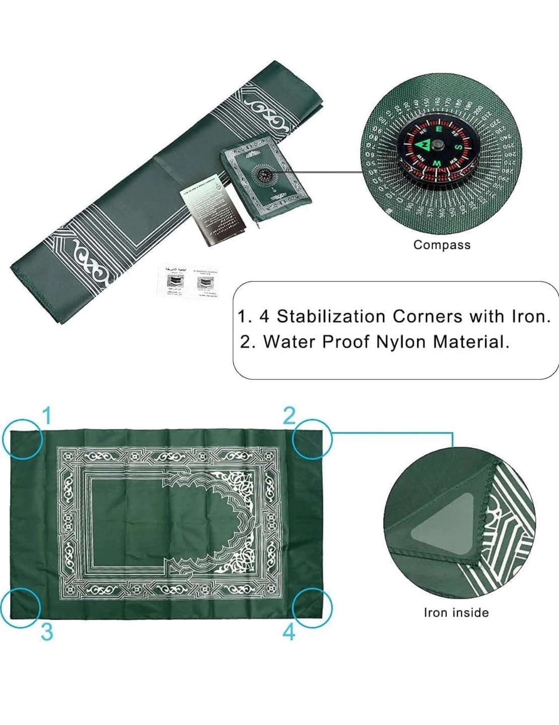 This is a portable prayer mat made from waterproof nylon material. It comes with a compass to help you find the Qibla. The mat has stabilization corners for easy setup. It's convenient for travel or daily use.