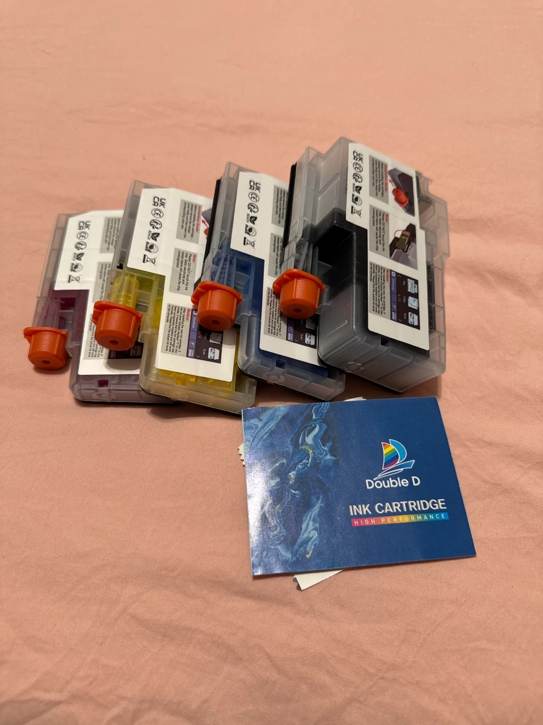 This listing includes a set of Double D high-performance ink cartridges. The set contains black, cyan, magenta, and yellow cartridges. These are designed for high-quality printing output. Comes in original box