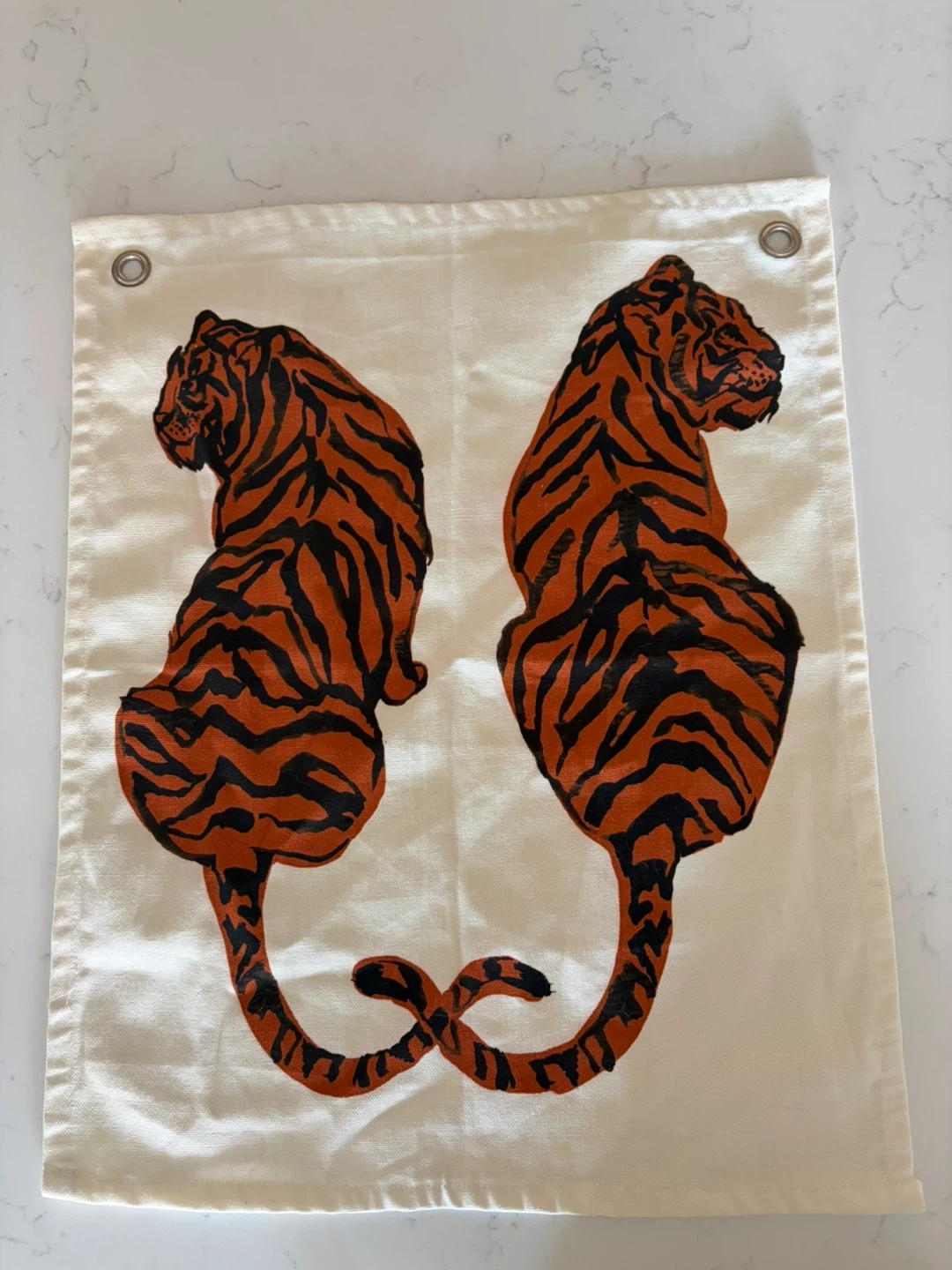 Canvas wall hanging featuring two orange and black tigers with their tails intertwined. It has two grommets at the top for hanging. Measures 16.5” x 20.5”