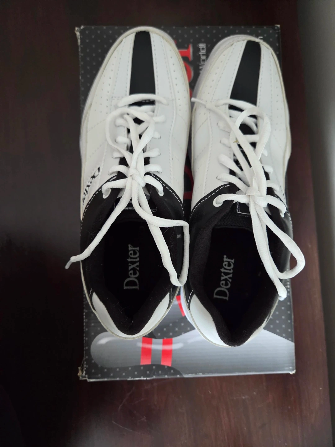 Dexter Ricky III bowling shoes in white and black. Men's size 7.5 M. These shoes have Slide-Rite soles. They come with the original box. Excellent condition, weren't worn for a full season. From a smoke free home.