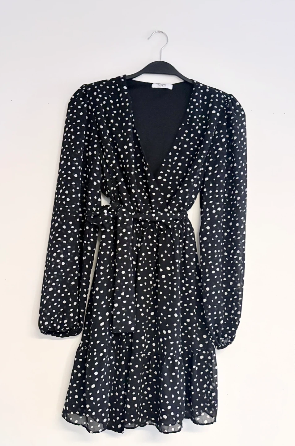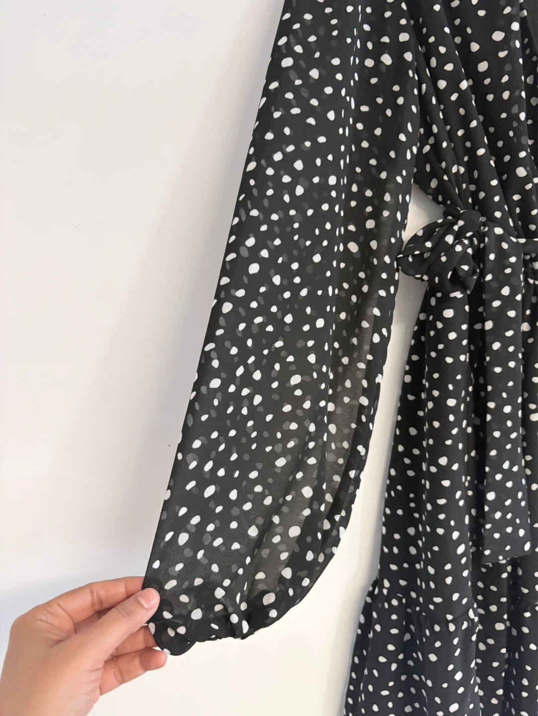 Wrap-style midi dress with long sleeves and a tiered hem.