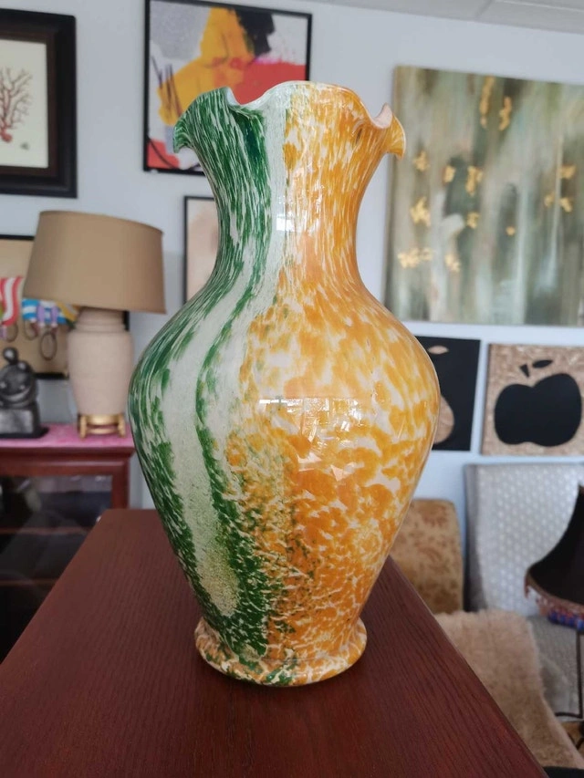 This striking, used vase features a unique blend of green, white, and orange hues, making it a vibrant decorative piece. Its elegant form and marbled colours add a touch of sophistication to any room. Due to its delicate nature, it's best suited for indoor display, away from direct sunlight to preserve its rich colours.