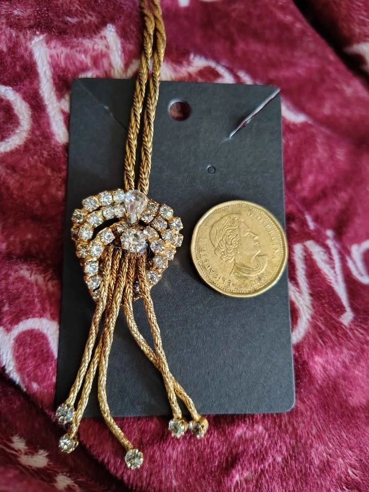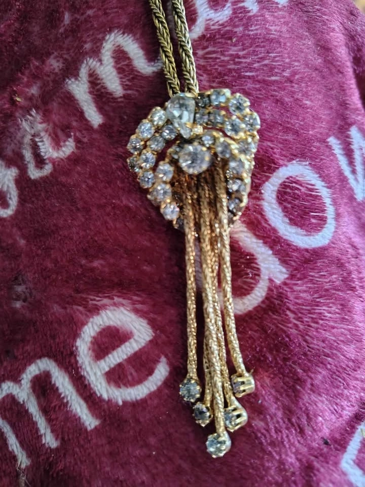 This is a rare vintage unsigned Hobe necklace from the 70s. It features dangling drops with gold plating and AB rhinestones. The necklace length is adjustable from 43-49cm, with a 7cm drop. Located in Crowsnest Pass.