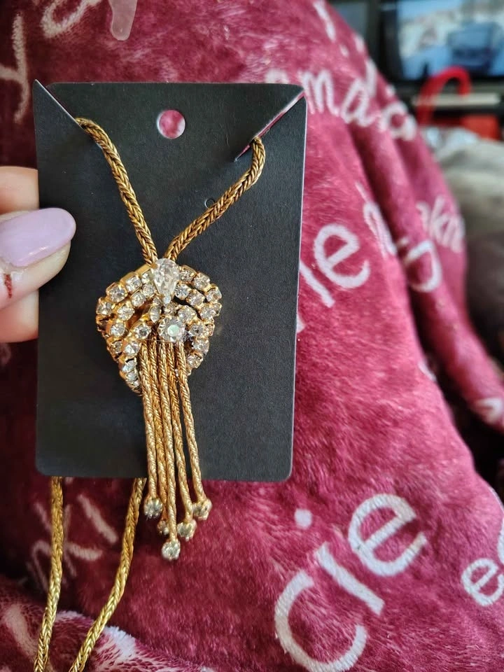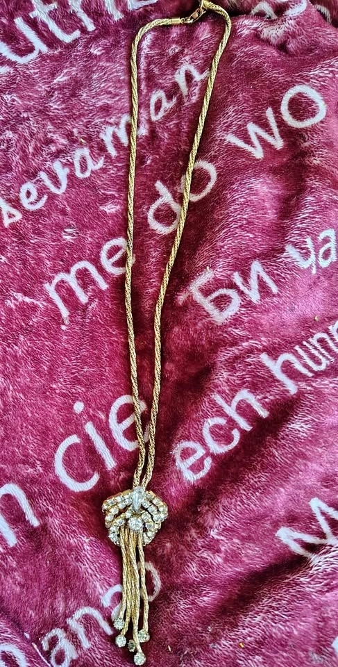 This is a rare vintage unsigned Hobe necklace from the 70s. It features dangling drops with gold plating and AB rhinestones. The necklace length is adjustable from 43-49cm, with a 7cm drop. Located in Crowsnest Pass.