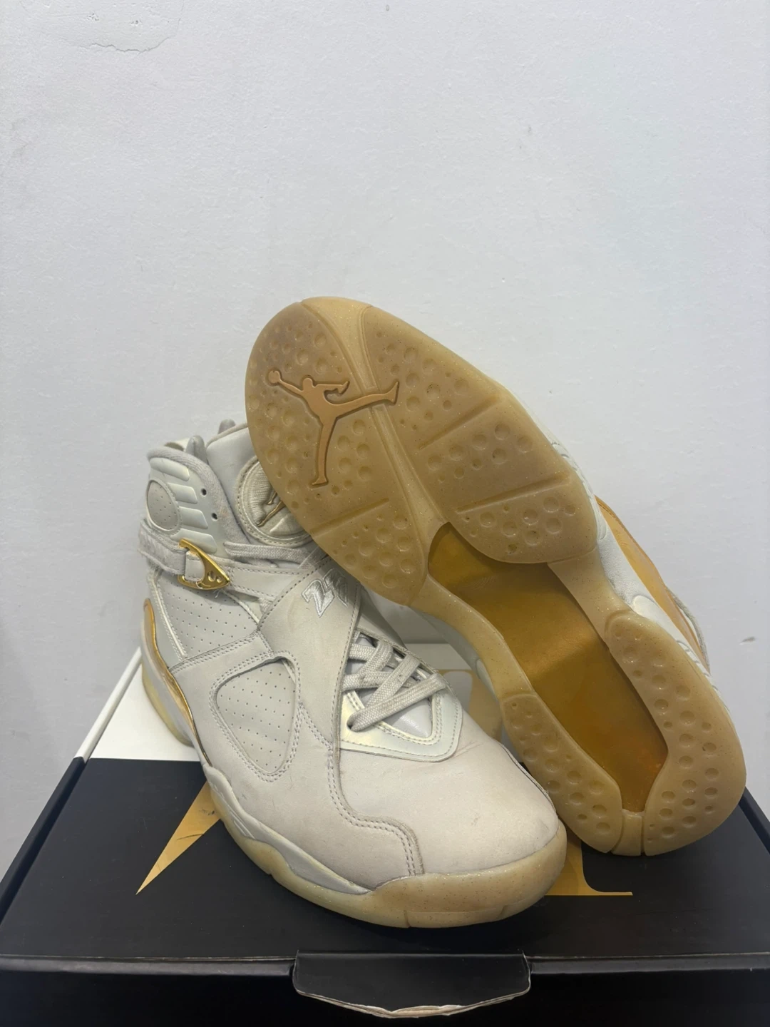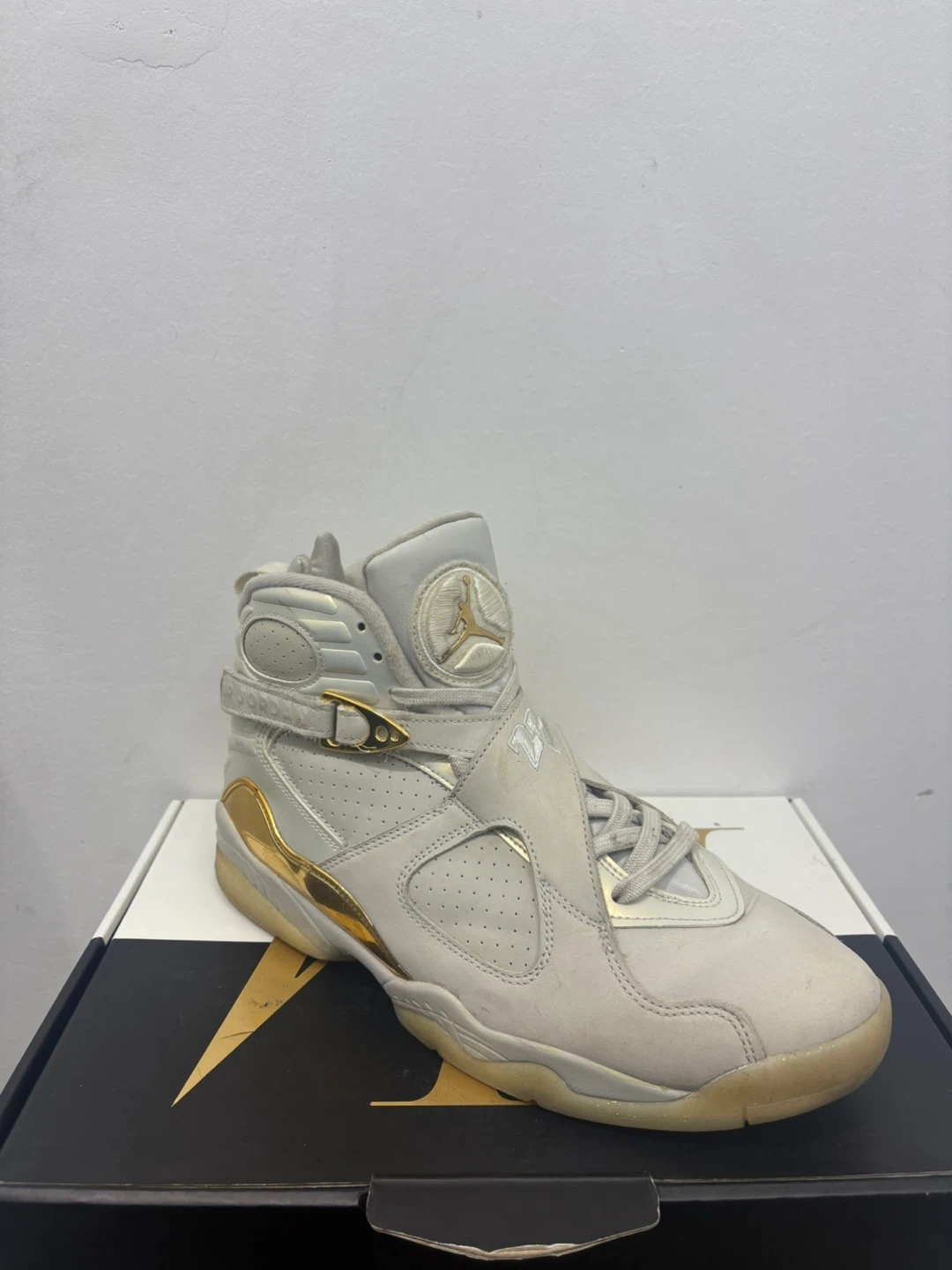 These Air Jordan 8 Retro sneakers are a size 9. They feature a light grey and metallic gold colourway. Includes original box.