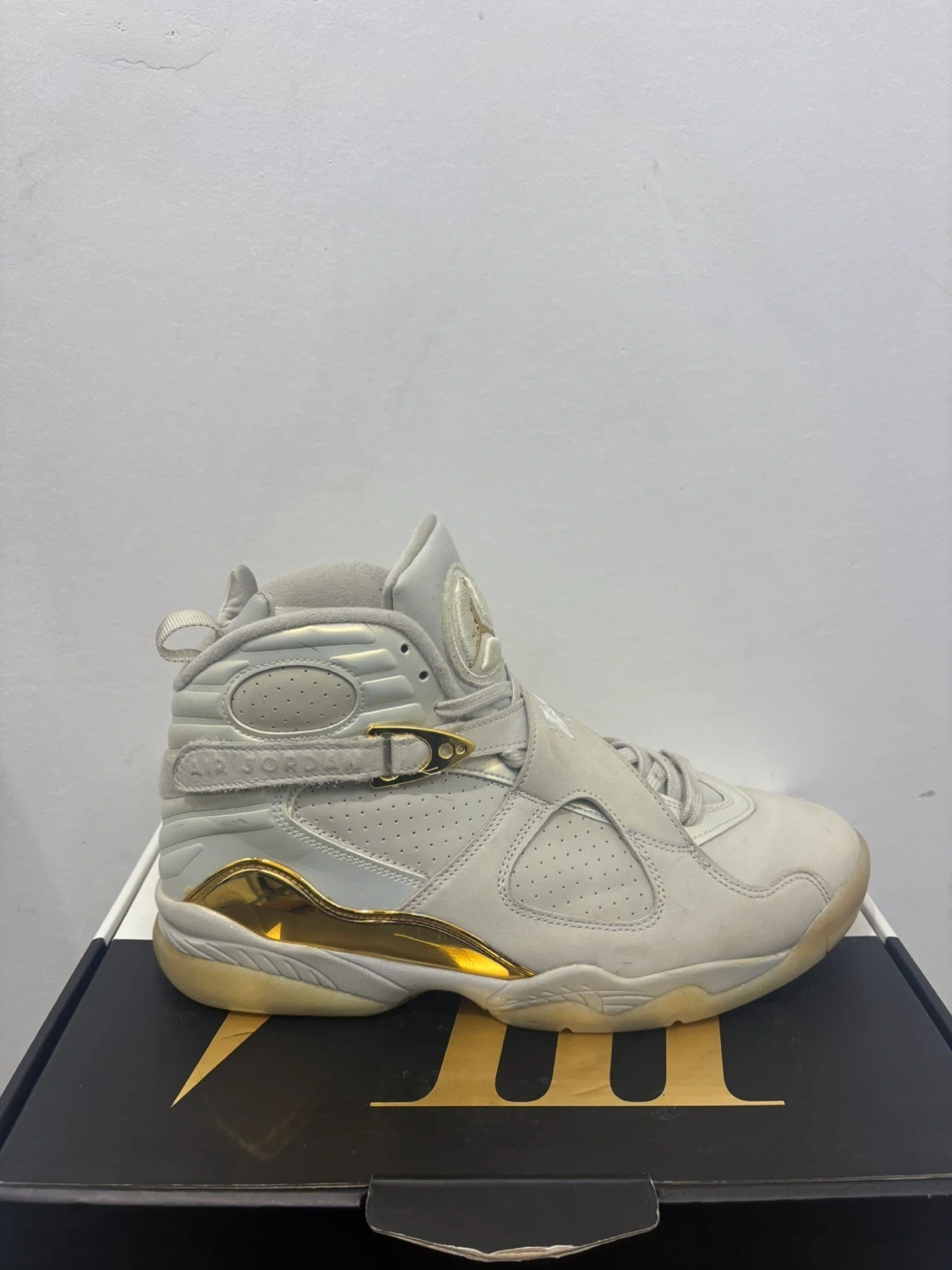 These Air Jordan 8 Retro sneakers are a size 9. They feature a light grey and metallic gold colourway. Includes original box.