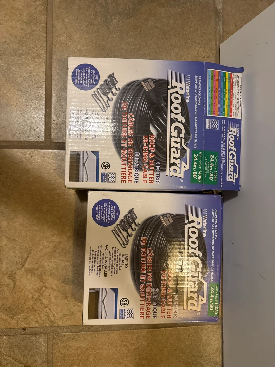 I have two boxes of Waterline Roof Guard electric roof and gutter de-icing cable. Each cable is 24.4m/80' long and 400 watts. They are designed to prevent ice dams and are easy to install on metal or plastic gutters and pitched roofs with tab shingles