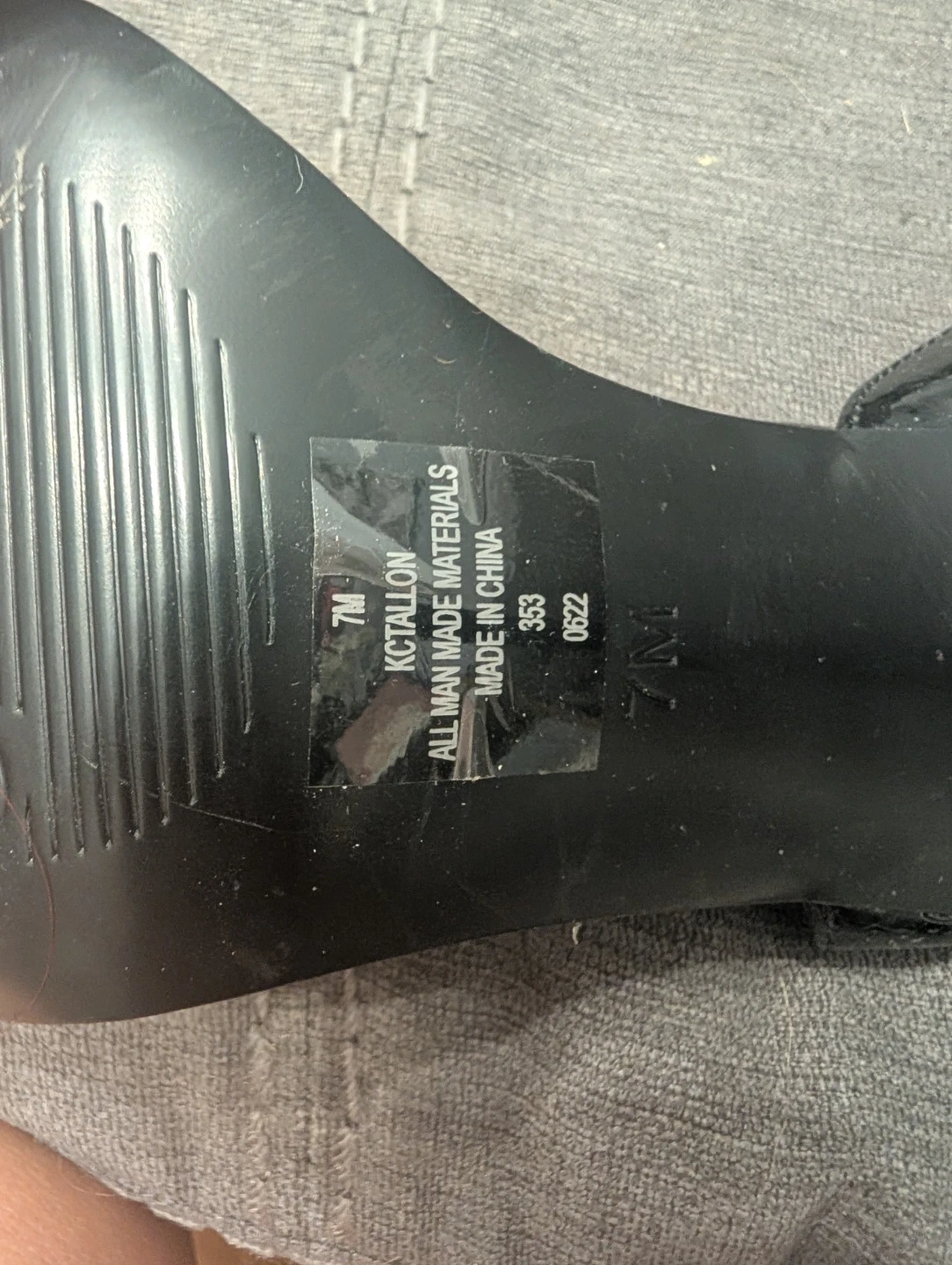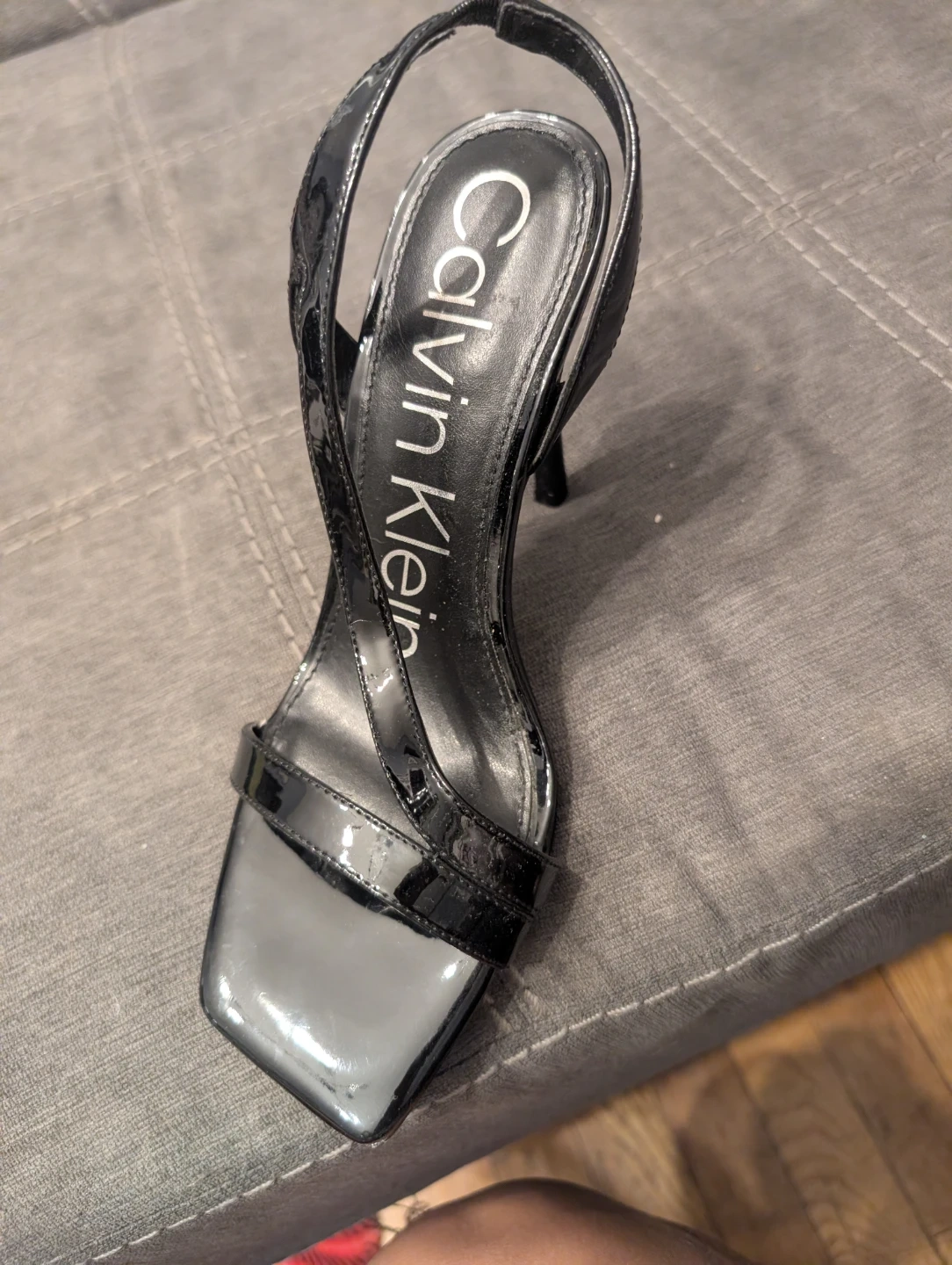 Black patent slingback heels from Calvin Klein. Features a shiny finish and an adjustable ankle strap. Made with all man-made materials. Size is 7M.