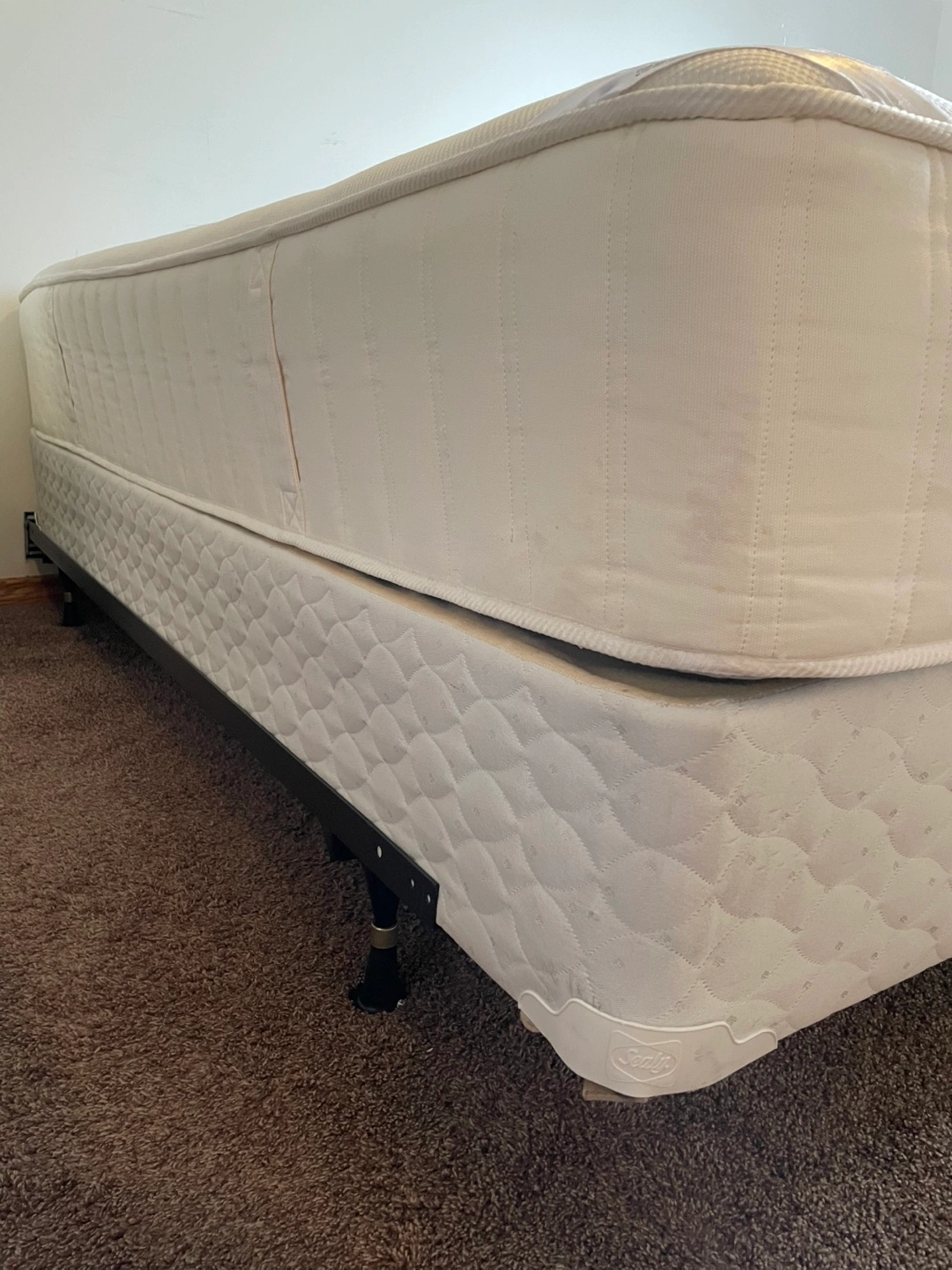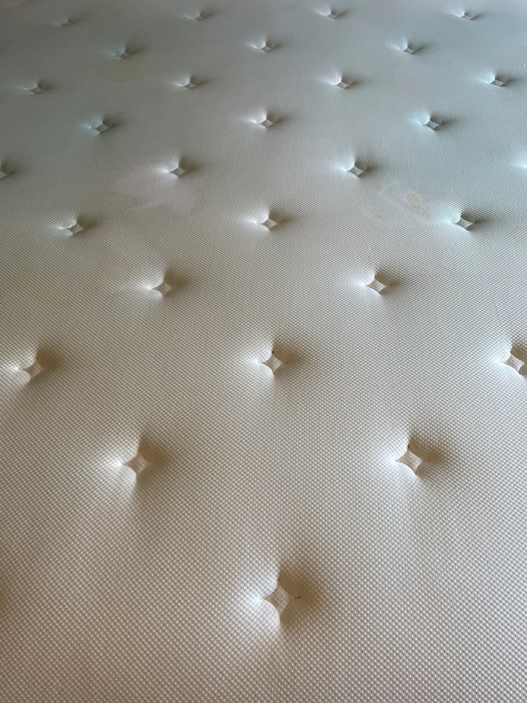 King size mattress & box spring set. Off-white fabric upholstery. Some minor stains. Good used condition. No delivery, only pick-up.