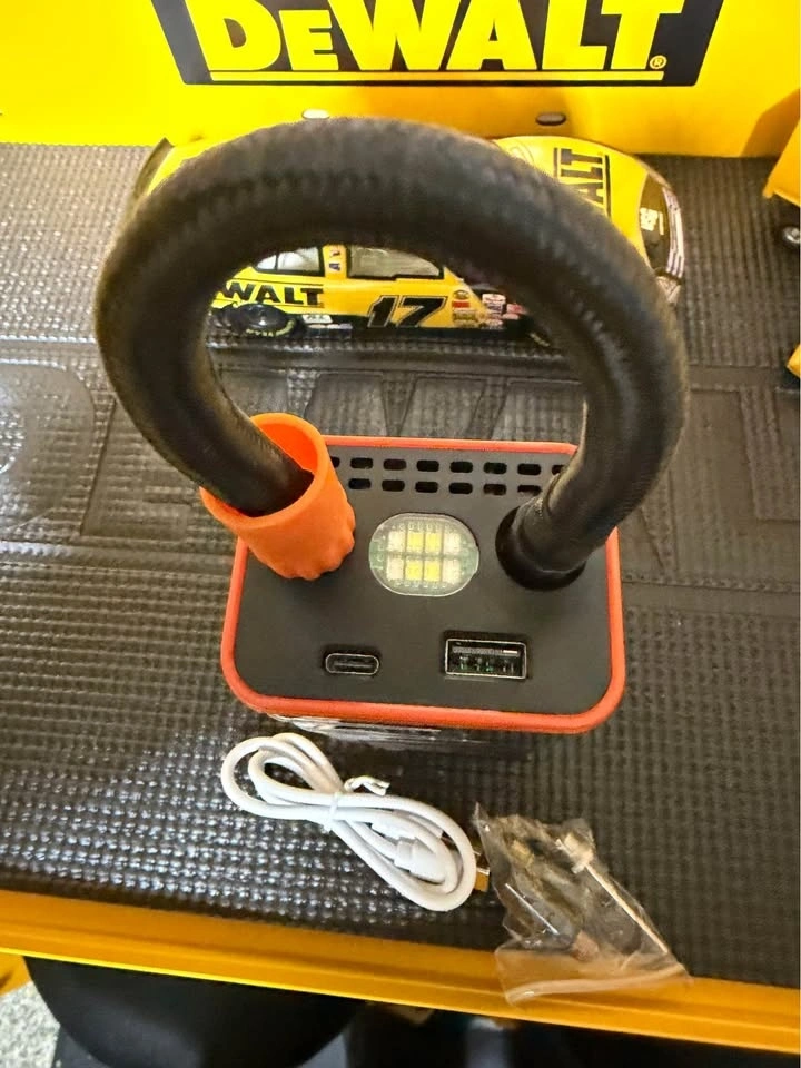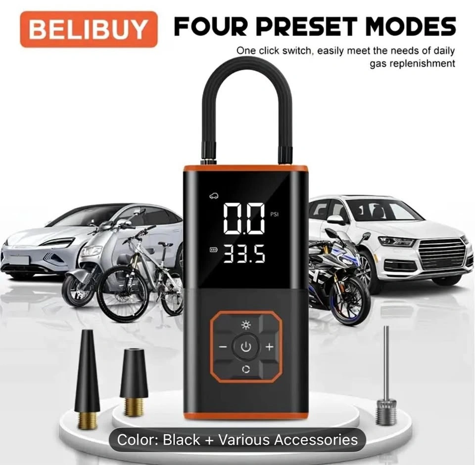 Brand new Belibuy handheld rechargeable compressor with a built-in flashlight, perfect for inflating tires and other inflatables on the go. It features a digital display, preset modes, and various accessories. It's compact, portable, and ready to use.